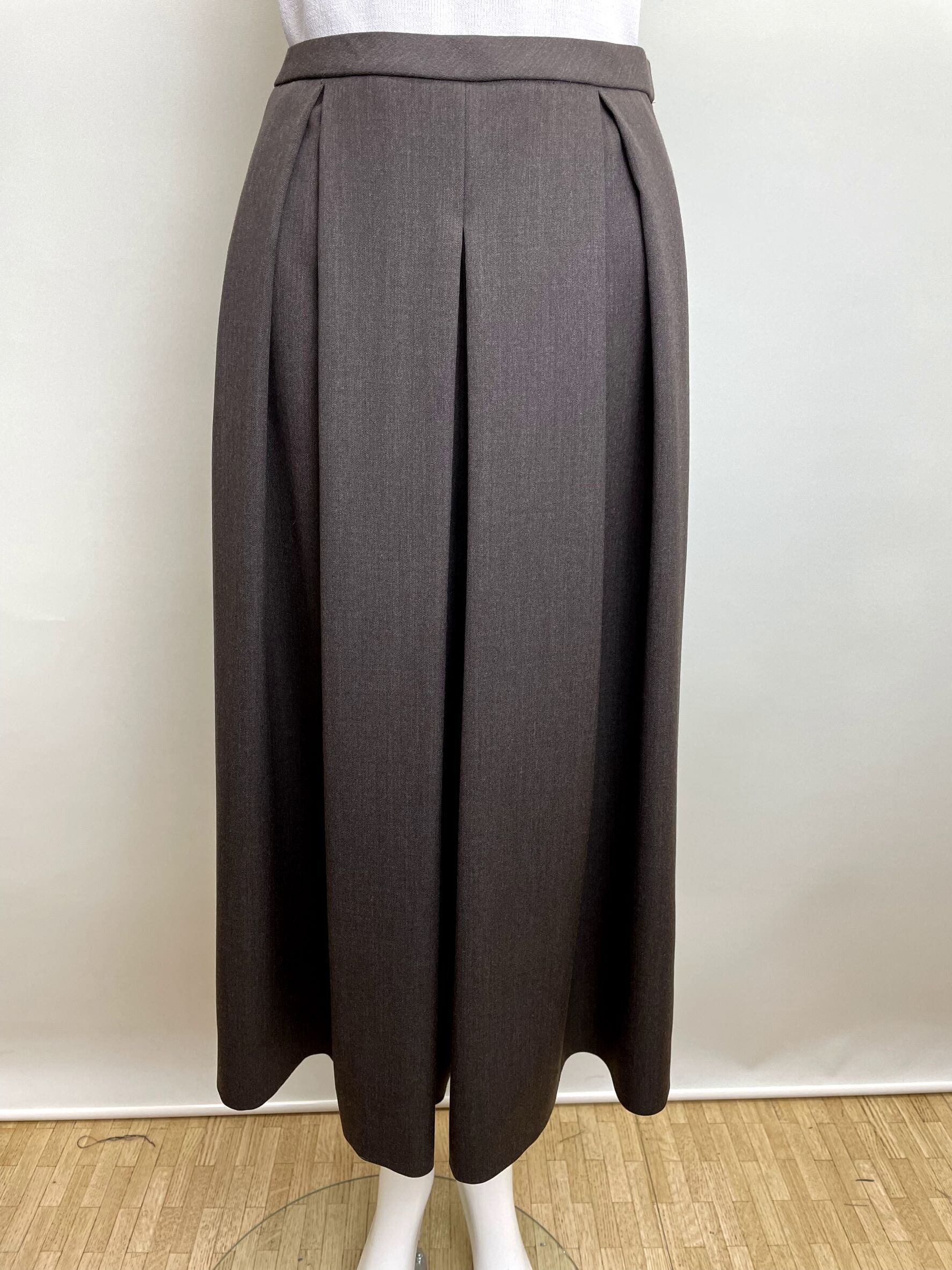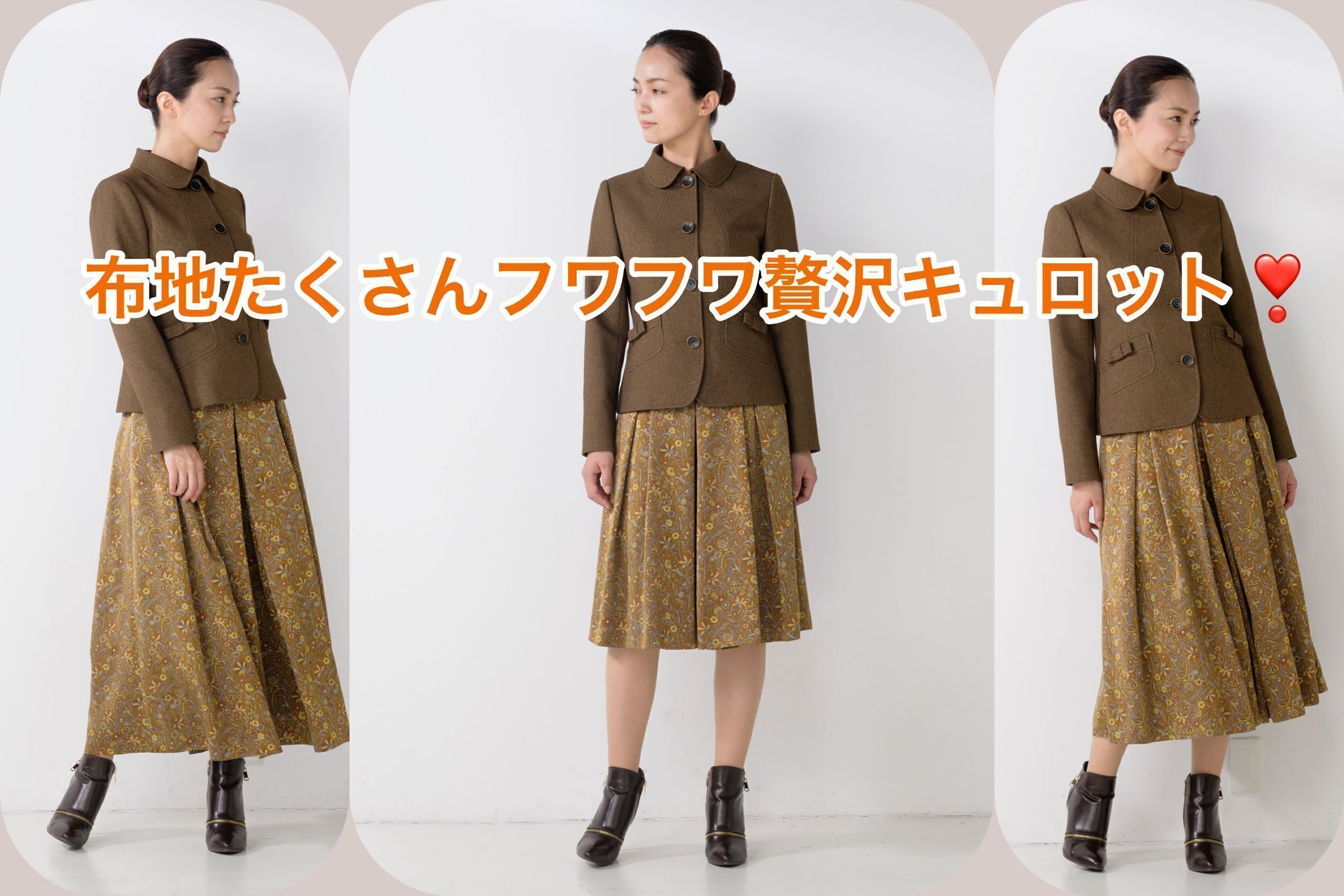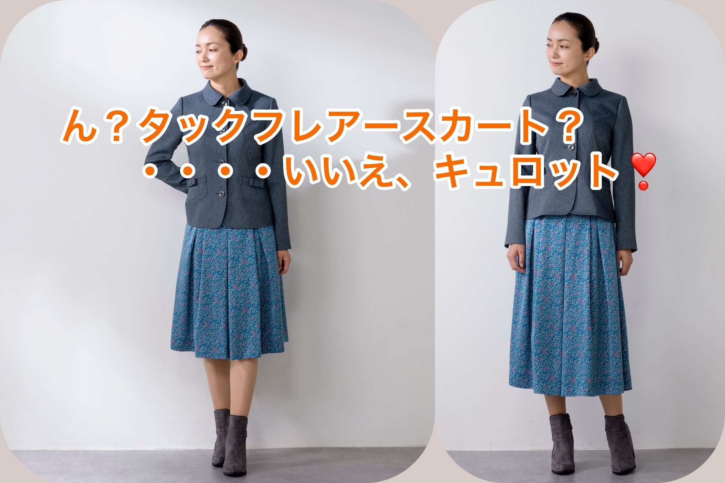 《デザインは、立っているとフレアースカート。歩くととても美しく揺れるタックフレアーのキュロットです。ウエスト寸法が合うと、どのような体型でも楽に履くことが出来て、シルエットも綺麗です。