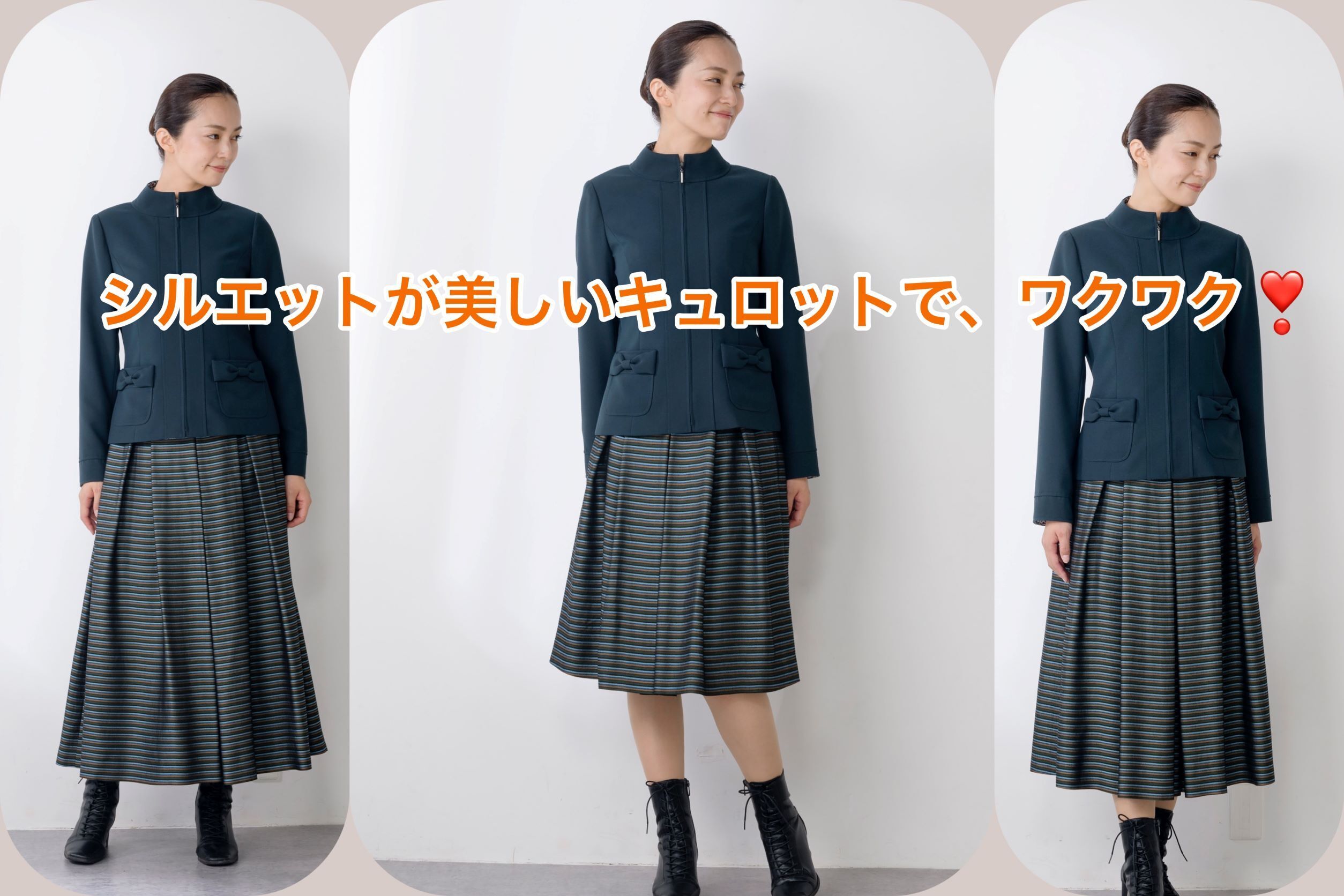 ★これは、ボーダー素材のキュロットに合わせています、ダークグリーンのジャケットですが、これは、前回の、クラウドファンディングキャンプファイアーで載せたものですが、今回問い合わせが有りましたので、再び、載せています。