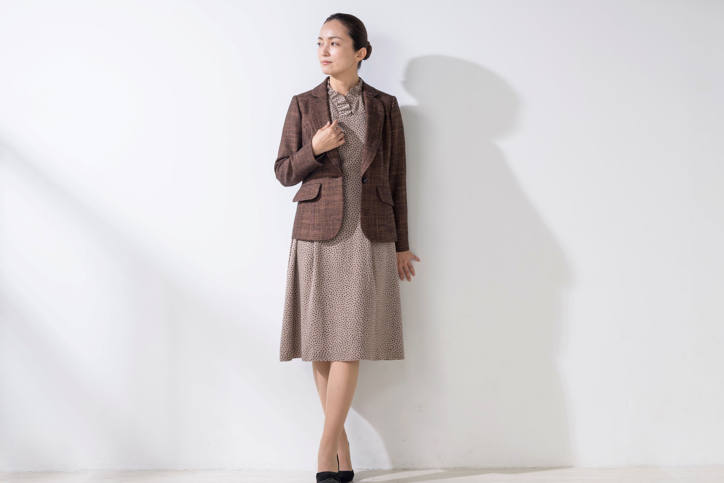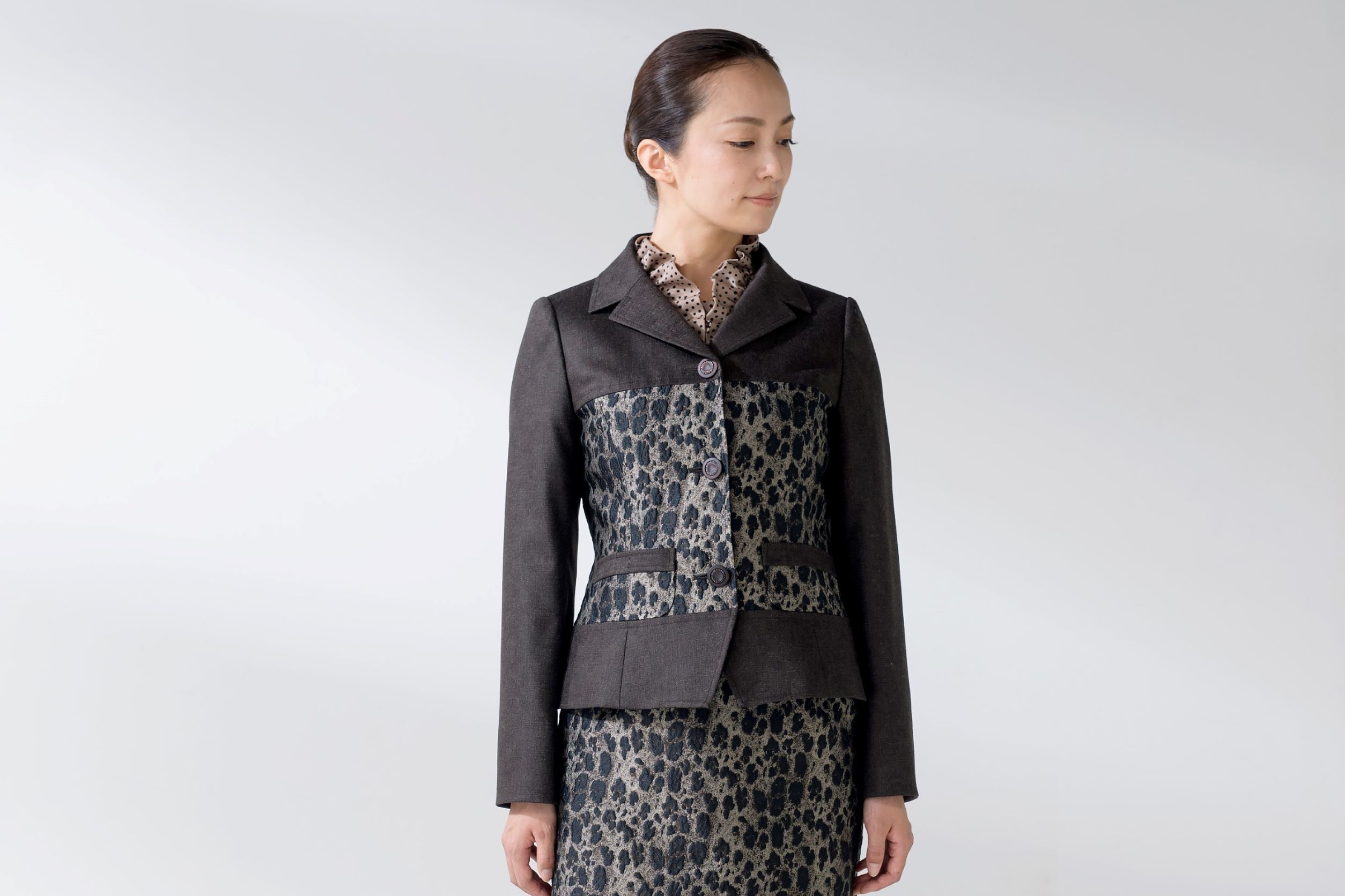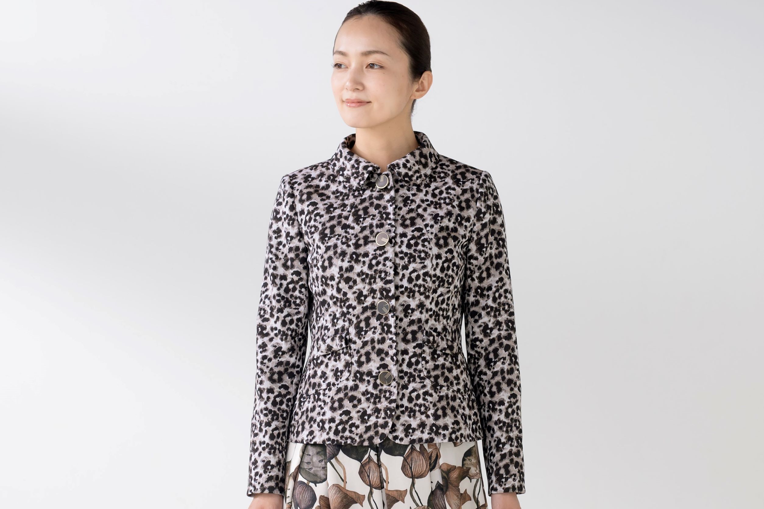 《イタリーのリモンタのアニマル柄のジャガードと国産のウールハイカウントフラノを使ってのジャケットです。二つの素材を横に切り替えて真ん中に、アニマル柄を配しました。横長のアウトポケット口を無地にした、テーラー衿ジャケットはシルエットがとても美しく、仕立ての良さとデザインがマッチして、エレガントでフェミニンで、非常に高級感あふれるジャケットです。スカート・ワンピースに合わせて、お出かけ着から、オケージョンまで安心して着れるジャケットです。★テーラーの衿は、インナーを着なくても大丈夫な開きにしています。》