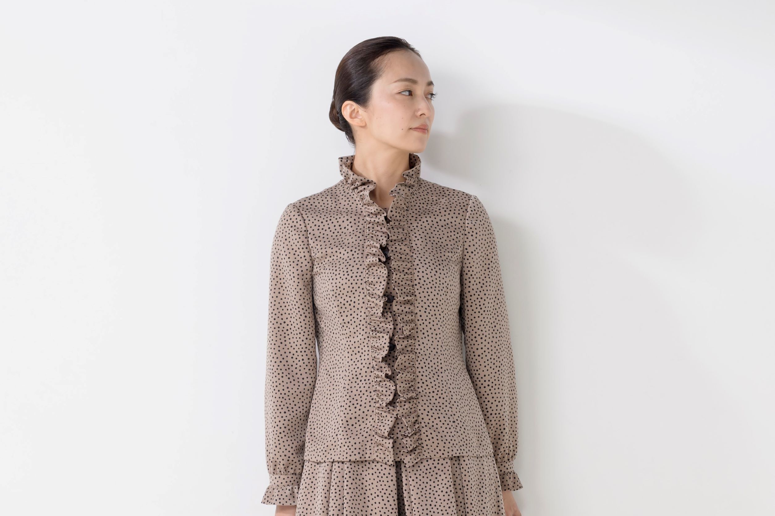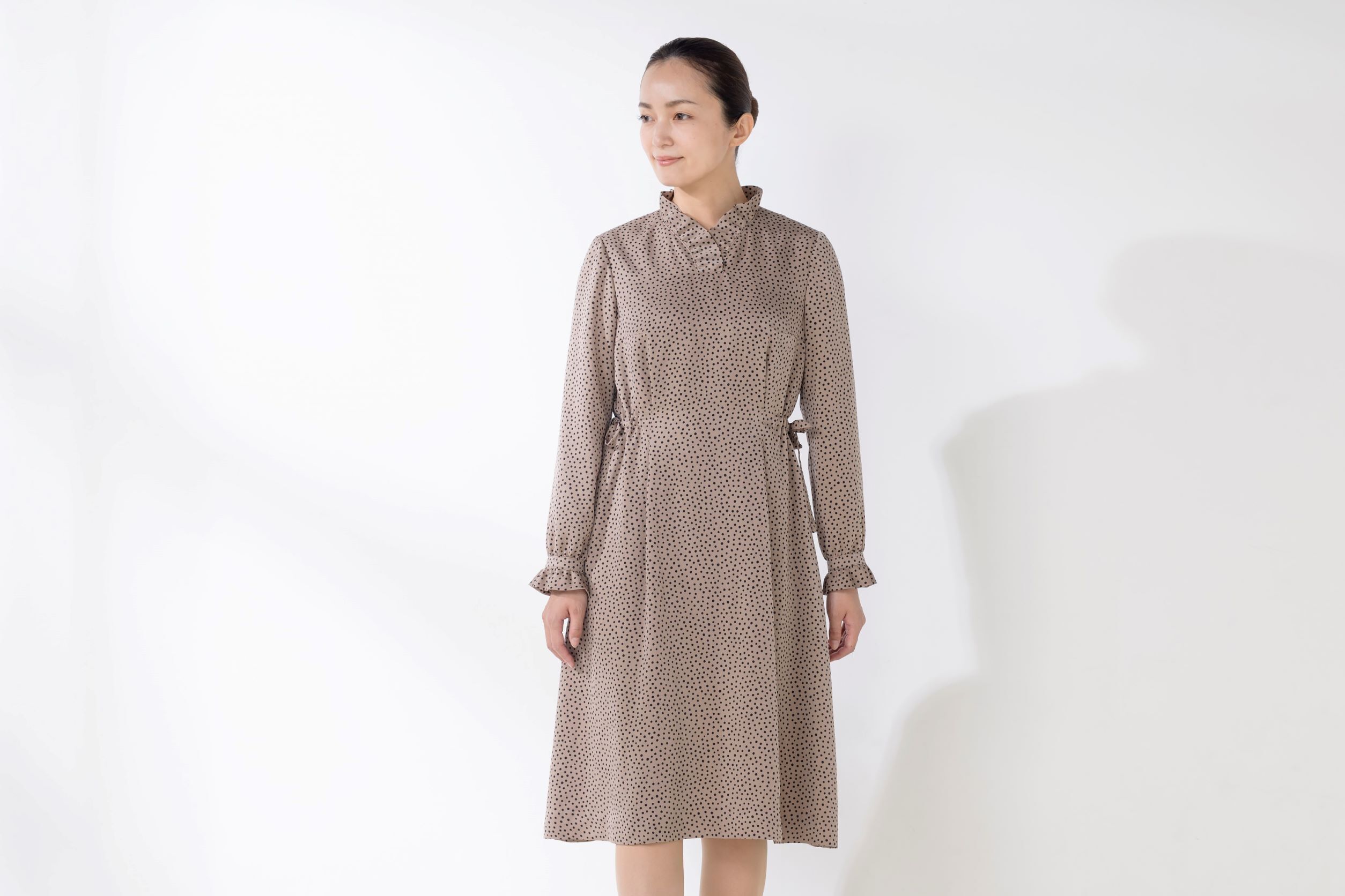 カラーは、ベージュに黒の小さなドットで、大きさがランダムで、かつ、並びも不規則にプリント柄が全体的に優しい雰囲気を作っています。》
