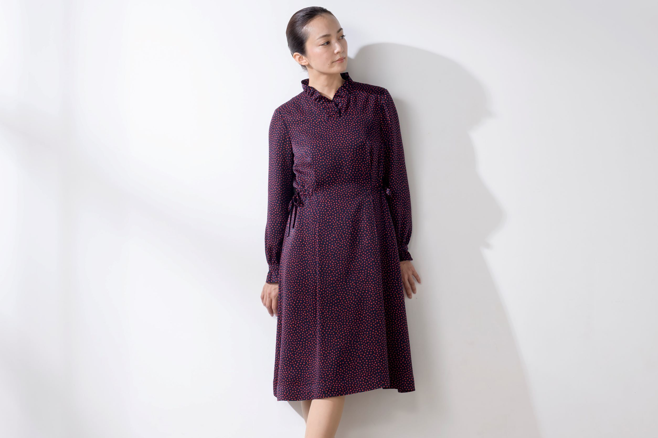カラーは、濃紺地に赤の小さなドットで、大きさがランダムで、かつ、並びも不規則にプリント柄が全体的に優しい雰囲気を作っています。》