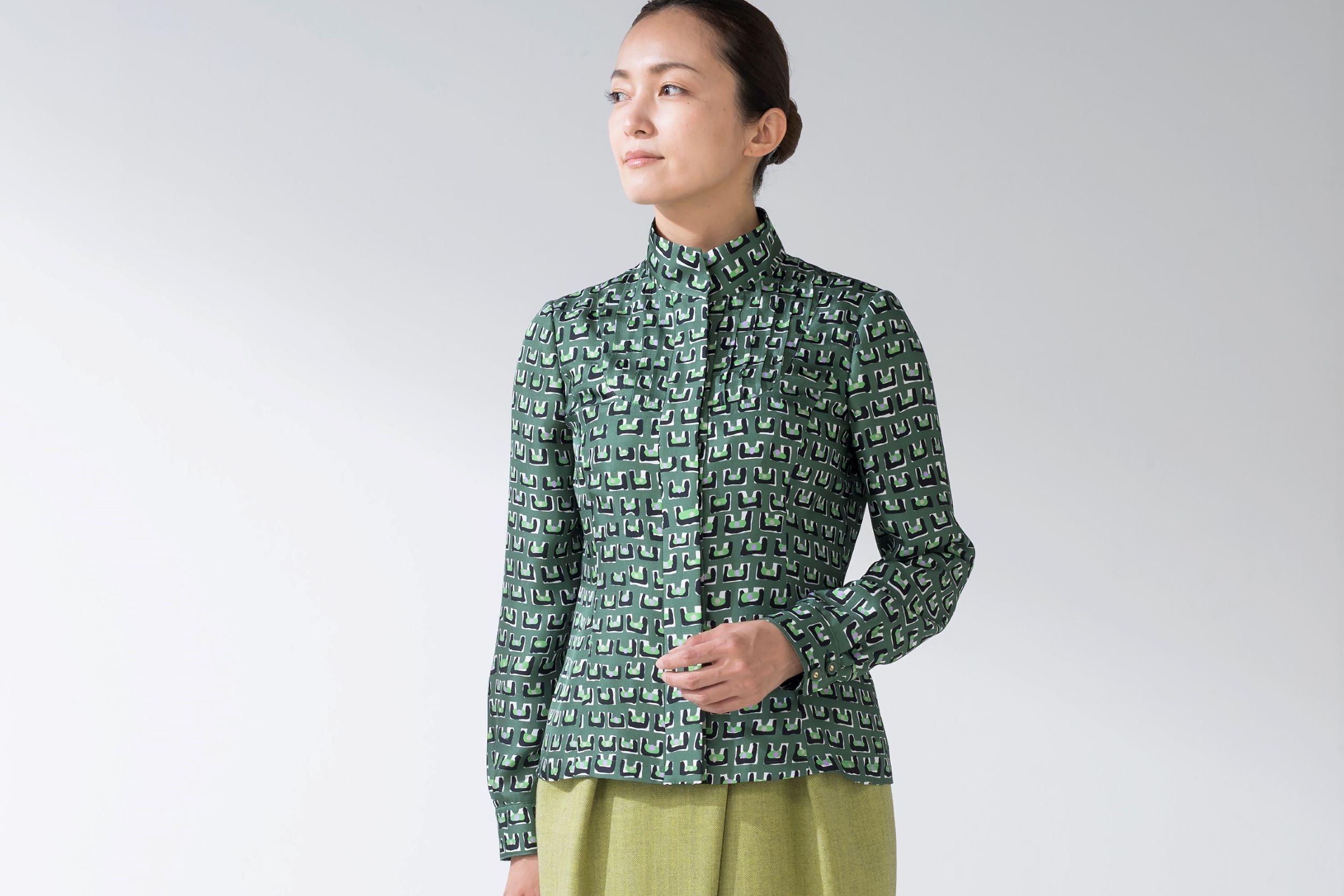 《イタリーのテシルのシルク100%のシルクプリントのブラウスです。スタンド衿で、前端はボタンが見えないように、ヒヨク仕立てで、前ヨークには、ピンタックが有り、凛とした雰囲気のブラウスです。幅広のタイが付いていて、衿元でリボンを結んだり、タイとしも使えます。》