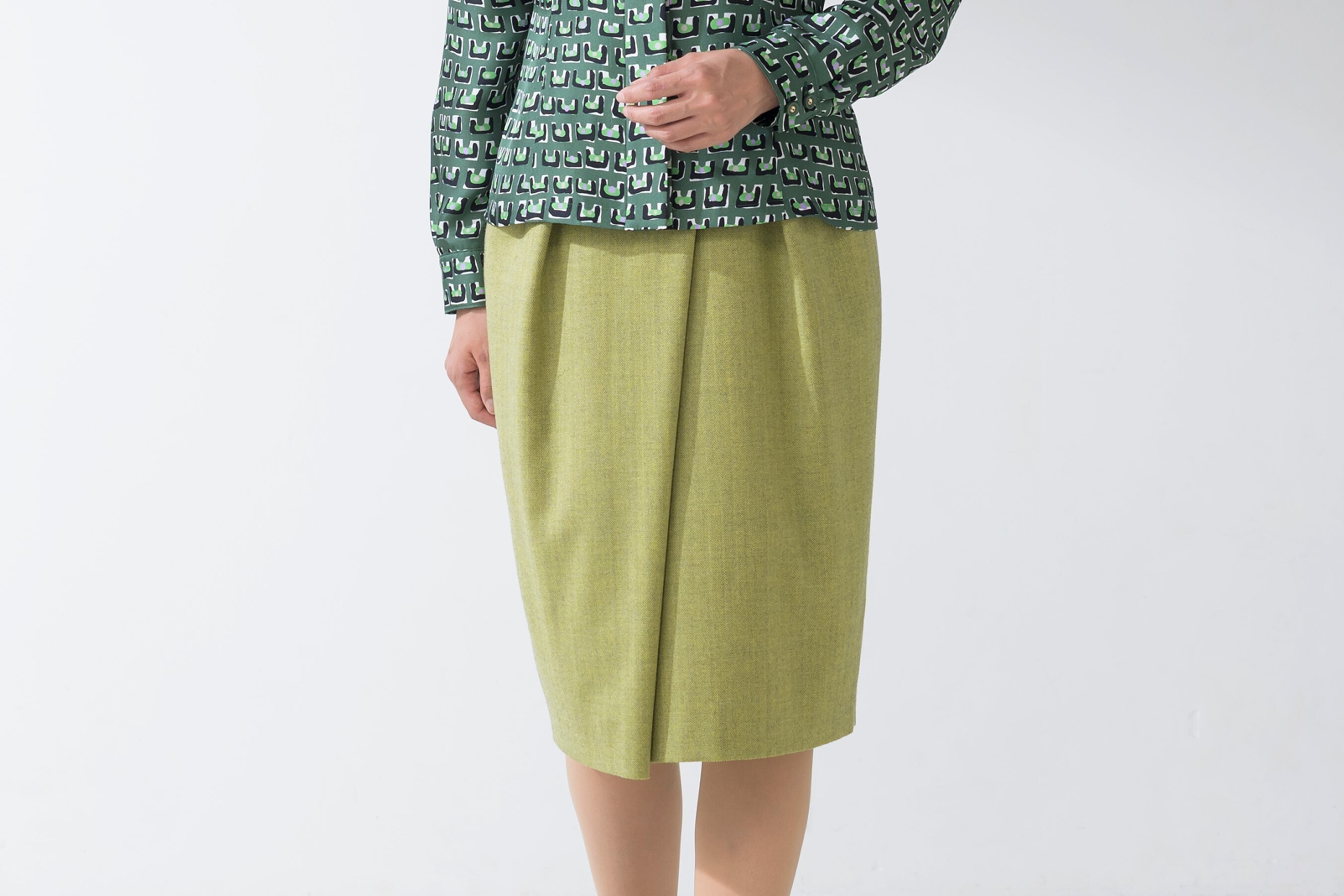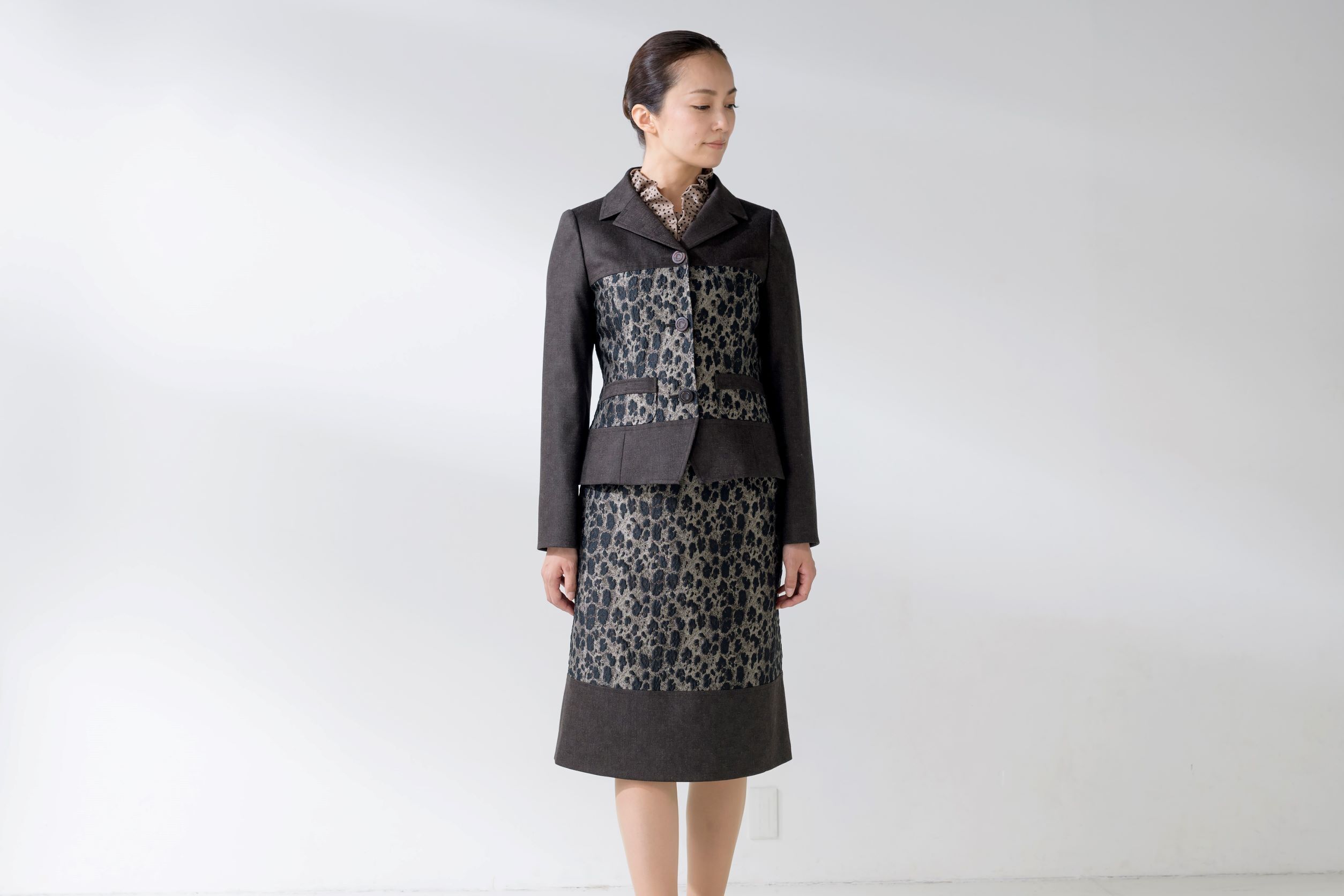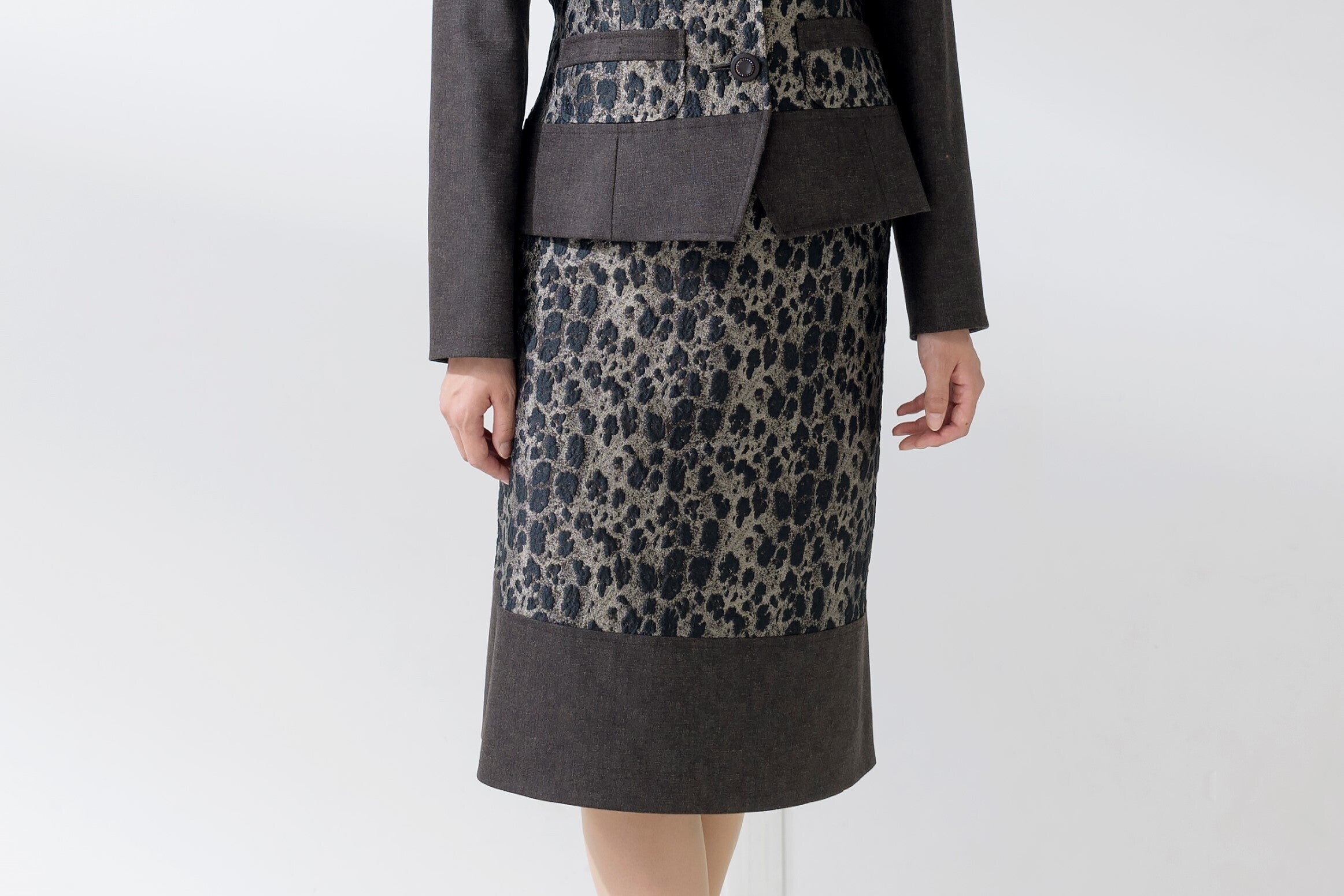 《イタリーのリモンタのアニマル柄のジャガードと国産のウールハイカウントフラノを使ってのスカートです。二つの素材を横に切り替えて裾に、無地を配しました。仕立ても良く、非常に高級感あふれるスカートです。ジャケット・ワンピースに合わせて、お出かけ着から、オケージョンまで安心して着れるスカートです。》