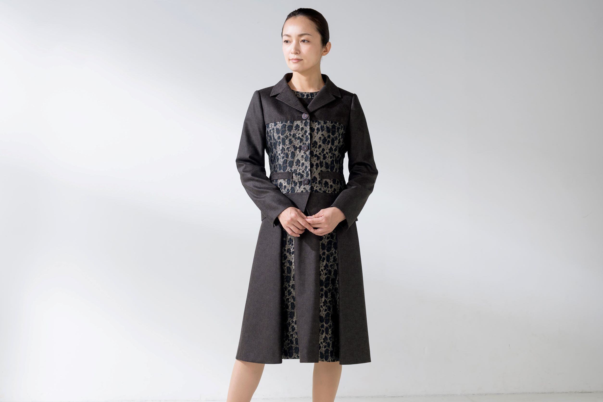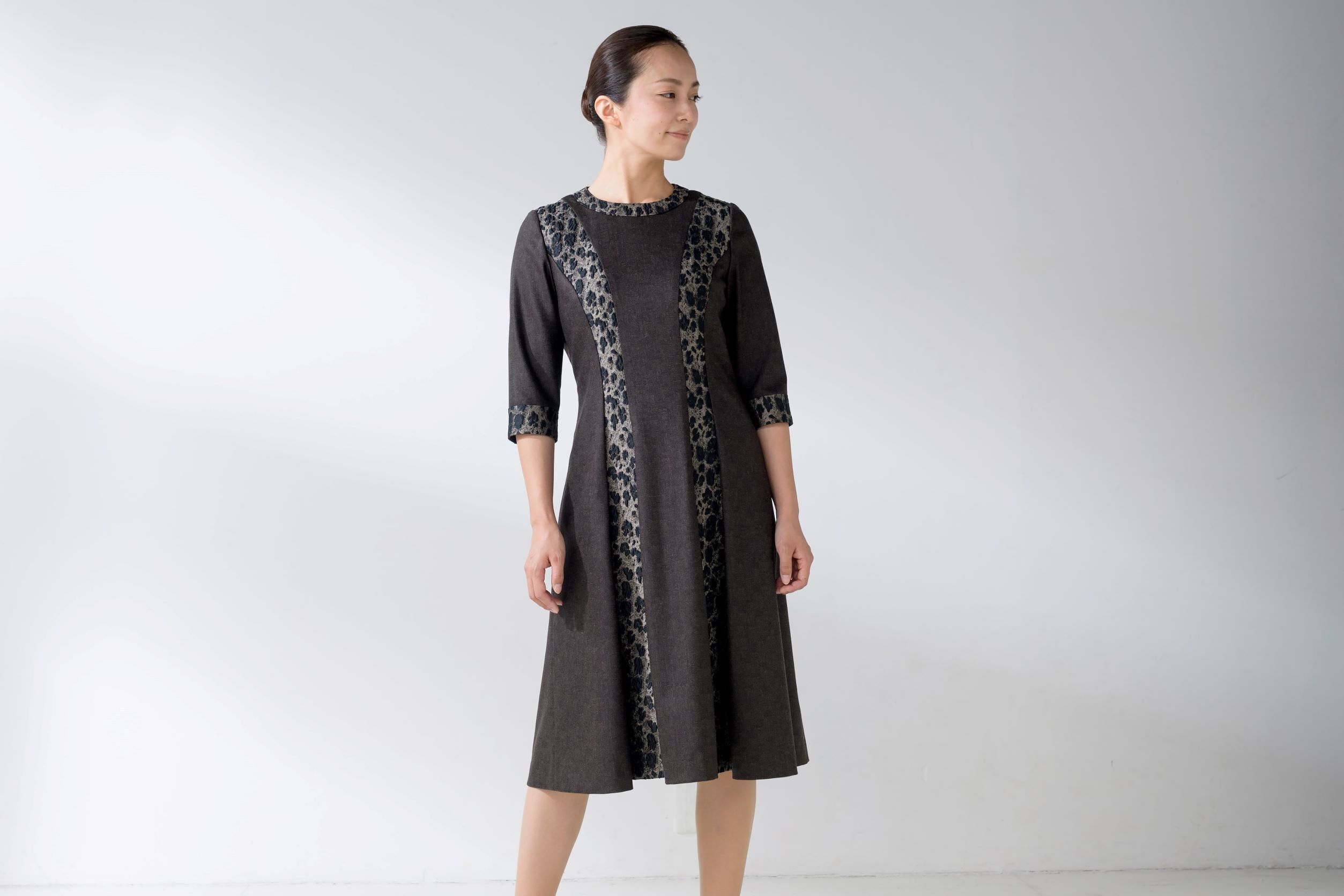 《イタリーのリモンタもアニマル柄のジャガードと国産のウールハイカウントフラノを使ってのワンピースです。二つの素材を縦の切り替えて無地にフレアーのシルエットを作ったワンピースです。シルエットがとても美しく、高級感あふれるワンピースで、お出かけ着から、ジャケットでセットで着るとオケージョンまで使えます。》