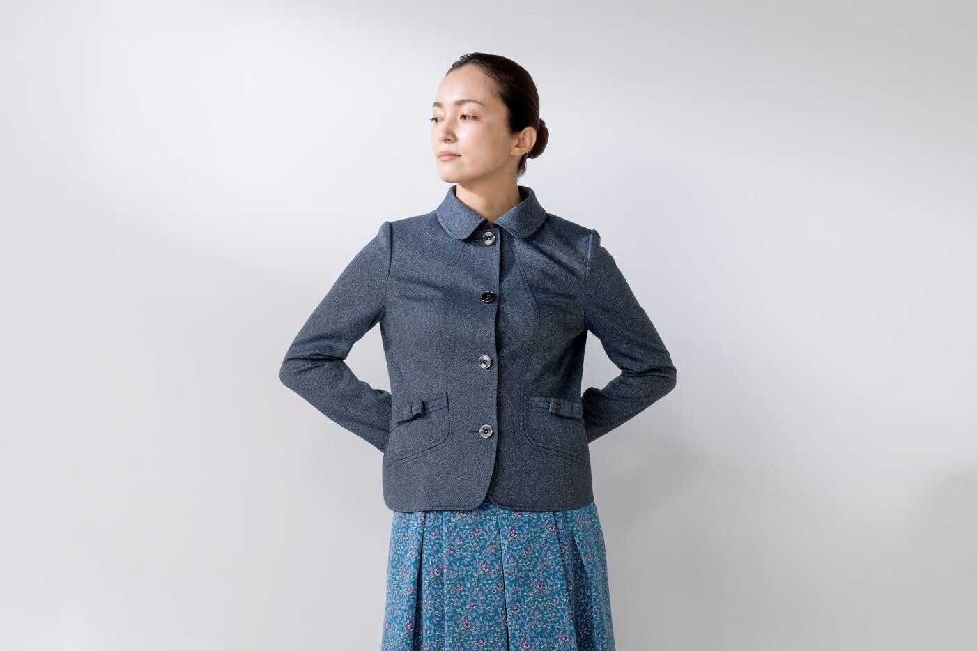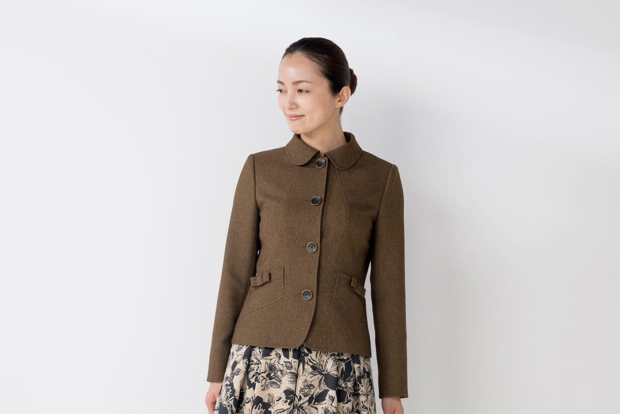 《国産のウールのウールのヘリンボーンでストレッチ性の高いツイードで、非常に着心地が良い素材を使ったジャケットです。大きめに空いてカーブした衿は、優しい品の良い雰囲気が漂います。腰と胸のアウトポケットには、口にベルベットテープが付いていて、その延長が後ろ身頃に続いています。ポケット端には、小さなリボンが控えめに品良く付いています。袖口にもベルベットテープが付いていて、非常に仕立てが良く、上質な素材で、高級感あふれるジャケットです》
