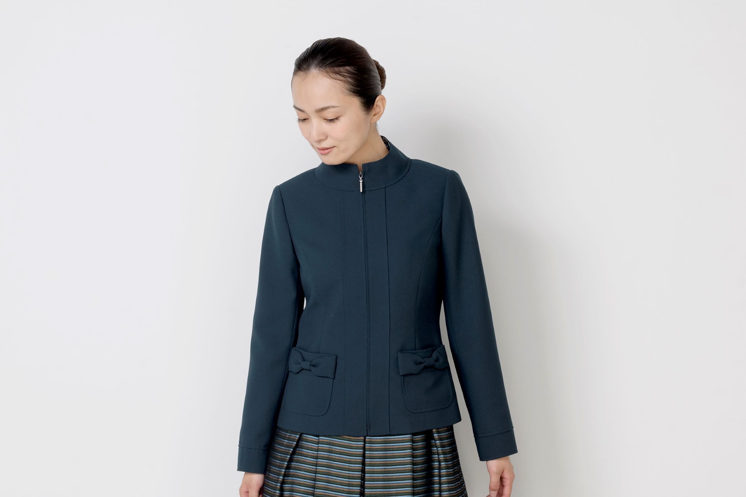 《国産のツイル素材です。非常にソフトで、しっとりした肌触りを持った、深いダークグリーンがとても素敵な素材です。前中心はオープンファスナーです。ポケット口のリボンが可愛いらしく素敵です。衿は45度位に傾けた上質で高級感漂うジャケットです★深いダークグリーンのカラーが本当に素敵で、色々なカラーのボトムスとコディネートできます。》
