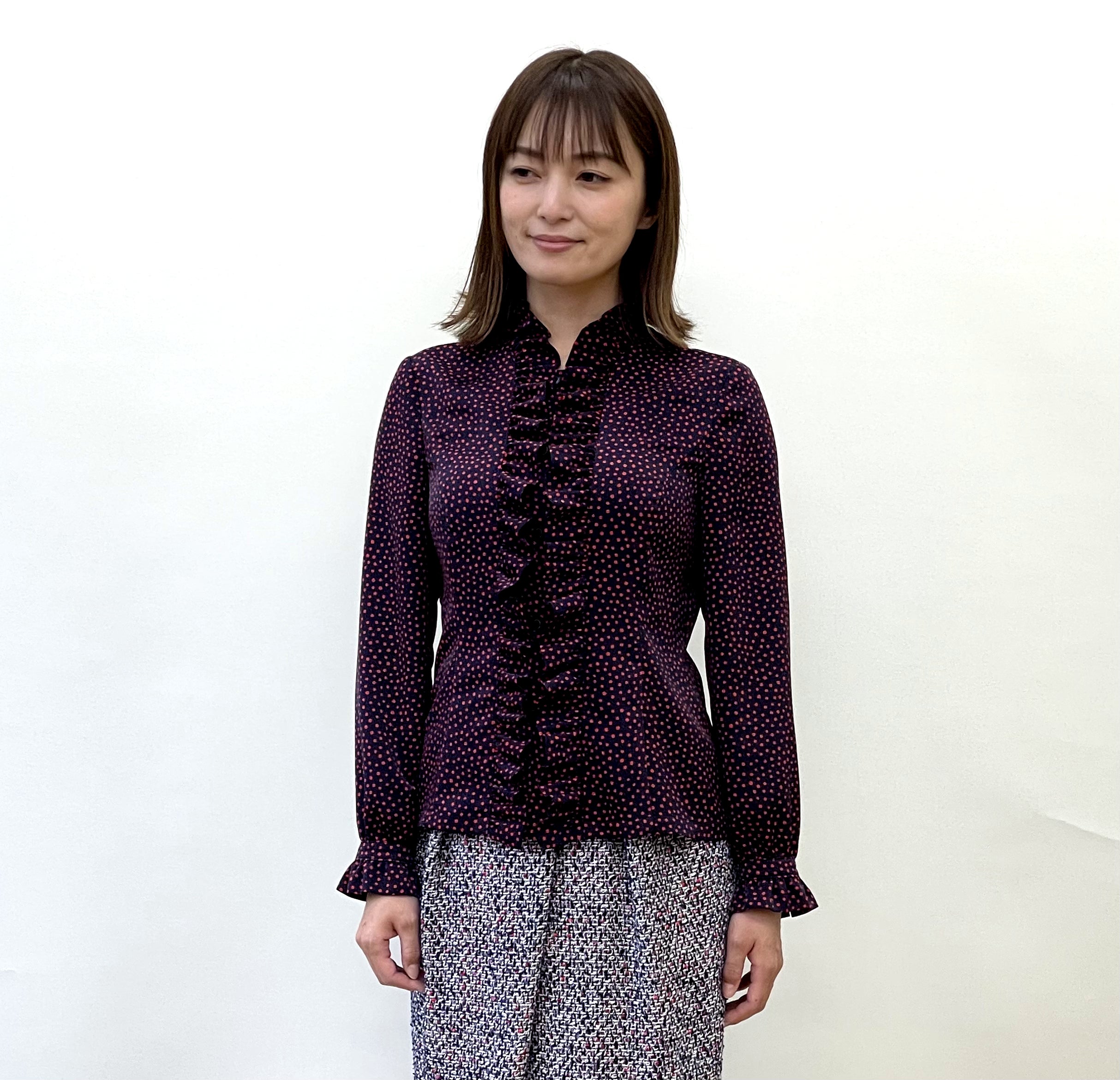 《イタリーのテッシレのシルク100%のシルクプリントのブラウスです。スタンド衿と前端にフリルを使って、ボタンが見えないデザインになっていて、ボタンが見えないことで全体的に上質感とエレガントさが溢れています。フリルの付いた衿は、開けて着ることも、衿元のボタンでスタンドにして着ることも出来て、とっても素敵なブラウスです。