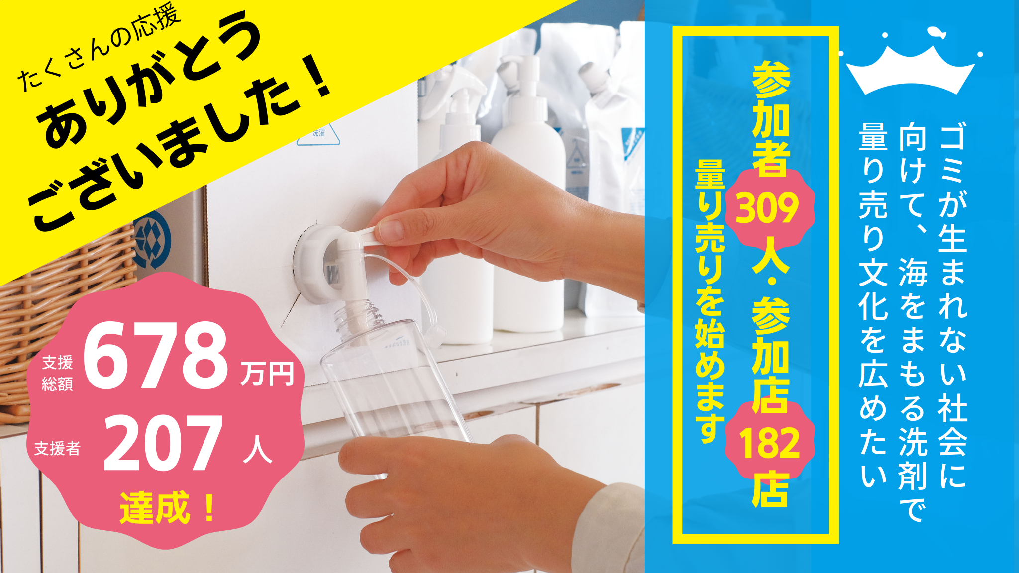 いつも大変お世話になっております。Save the Oceanです。この度、再びクラウドファンディングを実施することになりましたので、ご報告いたします。内容としては前回に引き続き、全国で海をまもる洗剤の量り売りができる環境を整備したい、という内容でお取扱い店様を募集するというものです。実施期間は、3/9(土)~4/14(日)です。クラウドファンディング特設サイトhttps://umi-mamoru.com/cf-sp/今回のクラウドファンディングでは、65%OFFという、最大限の割引を実施いたします。(返礼品の詳細は上記特設サイトから、 クラウドファンディングのページにてご確認ください)海をまもる洗剤は発売して以来、様々な販促を実施してきました。その中でも一番反応が良かったのが、"試供品のプレゼント"です。今回のリターンには、試供品用の洗剤が付属しています。ご支援いただいた店舗様では商品が届き次第、お客様への試供品配布キャンペーンを実施できます。一度試されたお客様は一定数、リピーターになってくださいます。ぜひ一度、ページをご覧いただけますと幸いです。クラウドファンディング特設サイトhttps://umi-mamoru.com/cf-sp/●詳細についてお聞きしたい方は、 クラウドファンディングの説明会をZOOMで行いますので、 ご連絡いただけますと幸いです。●追伸この取り組みは、Yahoo!ニュースで紹介されています。クリーニング店で洗剤を量り売り 「家庭用洗剤を購入できる場」という新たな価値を提案https://news.yahoo.co.jp/articles/0780467f39e1a183c8c1e56ac2d18edcd5d27356