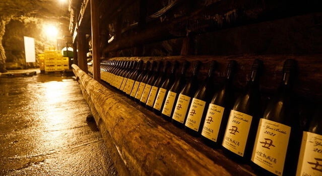 天然の洞窟貯蔵庫なので冷蔵庫のように電気動力を使わず、長期間に渡って環境負荷なく自然にお酒を育ててくれる夢の貯蔵庫。そのコンディションの良さから、原酒でなく割り水しバランスを整えた状態で、長期熟成、馴染ませられる利点があります。そう、あのシャンパンの持つブレンドバランスを整えてから瓶熟成するスタイルが、同じように使えるのです。