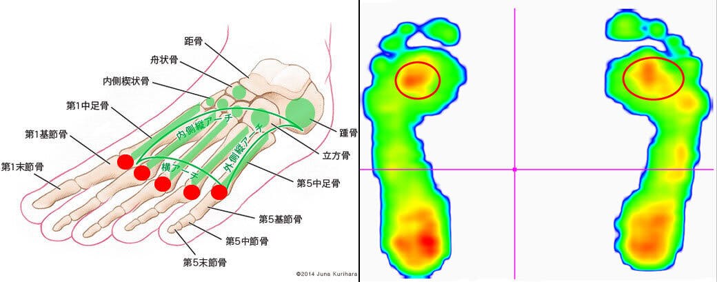それに加えて私が考えるもので、左図の赤い点で示したMP関節部(指球部)で構成され、右図の体重分布図でも分かるようにMP関節部(指球部)の中央に重心がくる「下凸横アーチ」があります。
