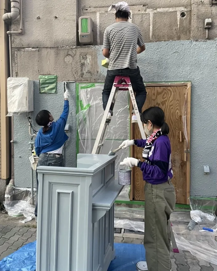 オープン前にビニールシートを敷いて、外壁とレジ台を1日かけて