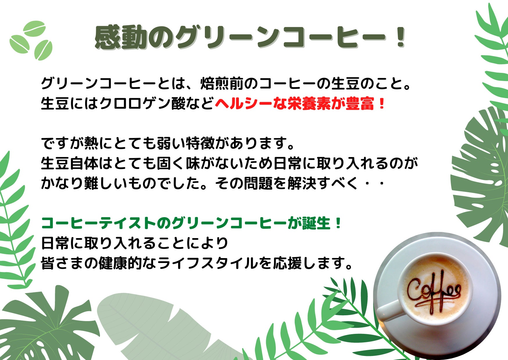 飲めば飲むほど健やかになれる感動のグリーンコーヒー。