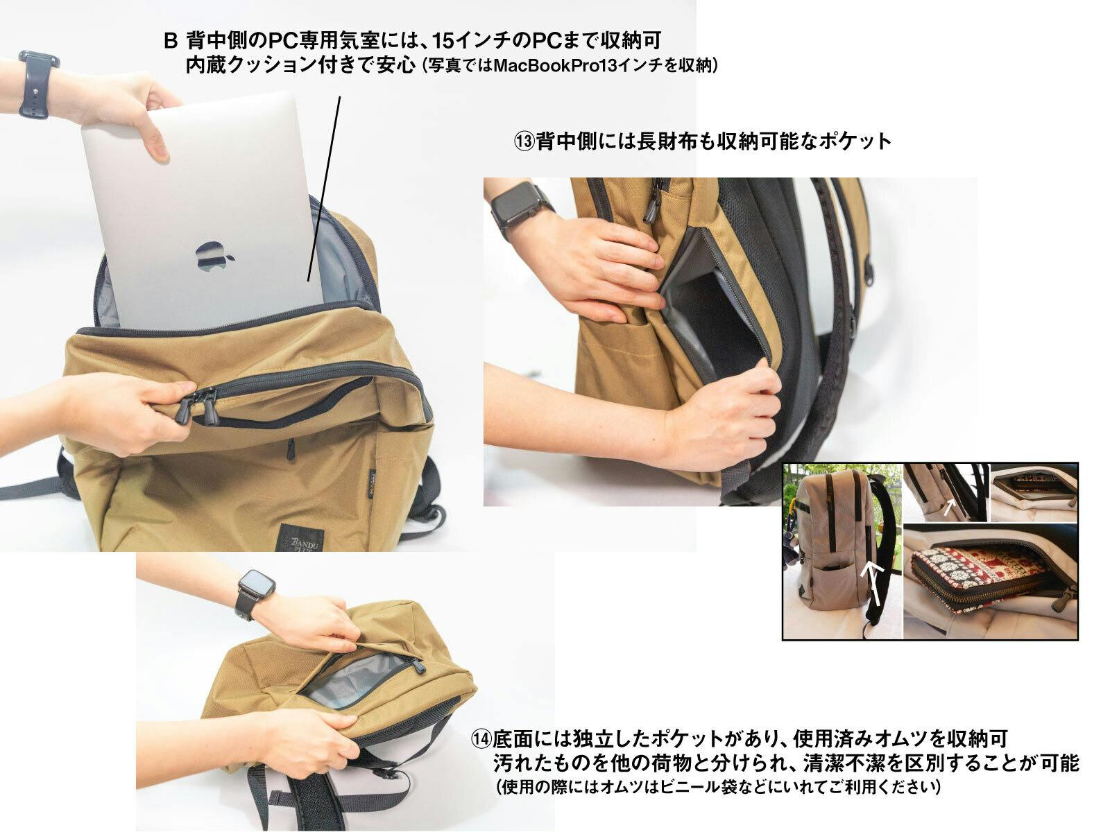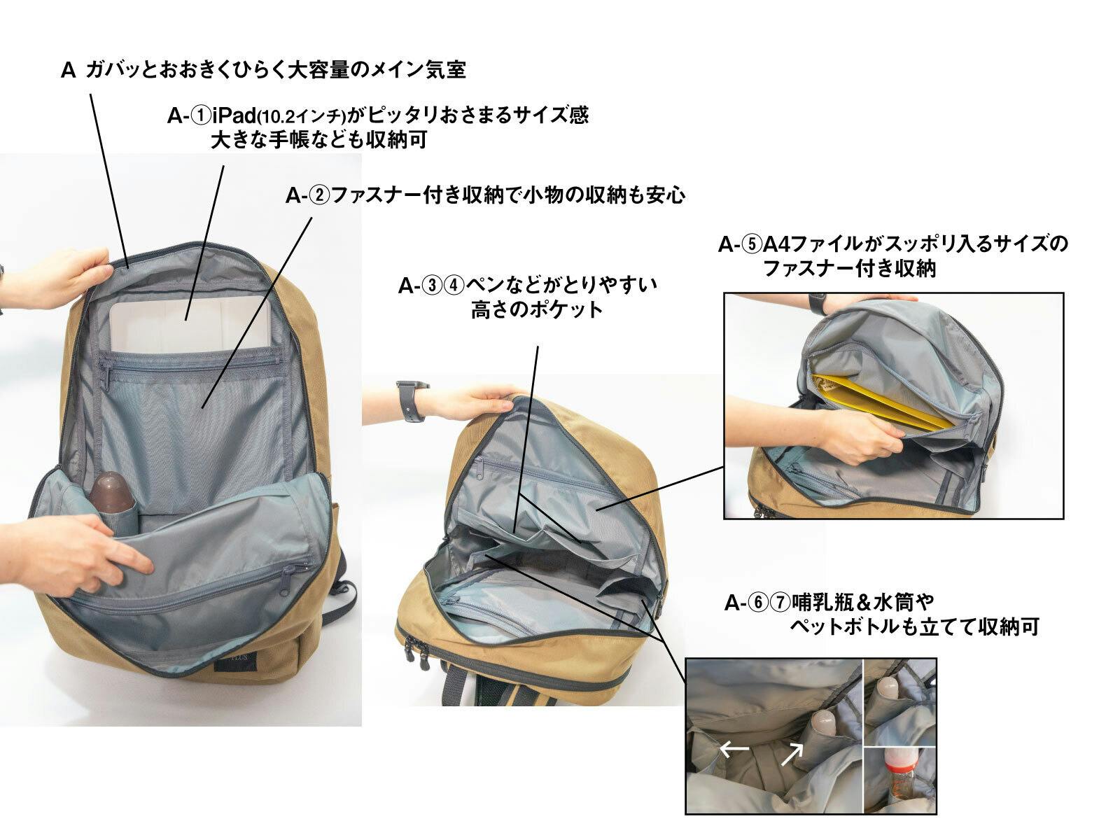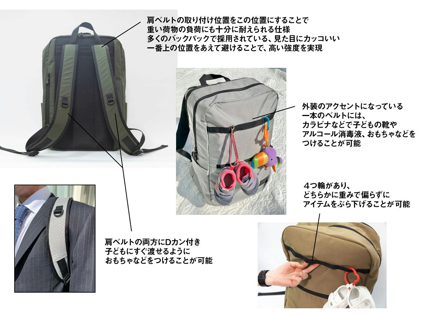 でもその中に、哺乳瓶や水筒を入れ、独立したポケットに汚れたオムツもしまうことができる。外側には抱っこするときに脱がせた靴をぶら下げられたり、電車やバスの中でぐずったときにあやすおもちゃがすぐ取れる位置につけられたり、子どもを出勤途中に保育園に送り届けるパパの救世主的バックパックです。