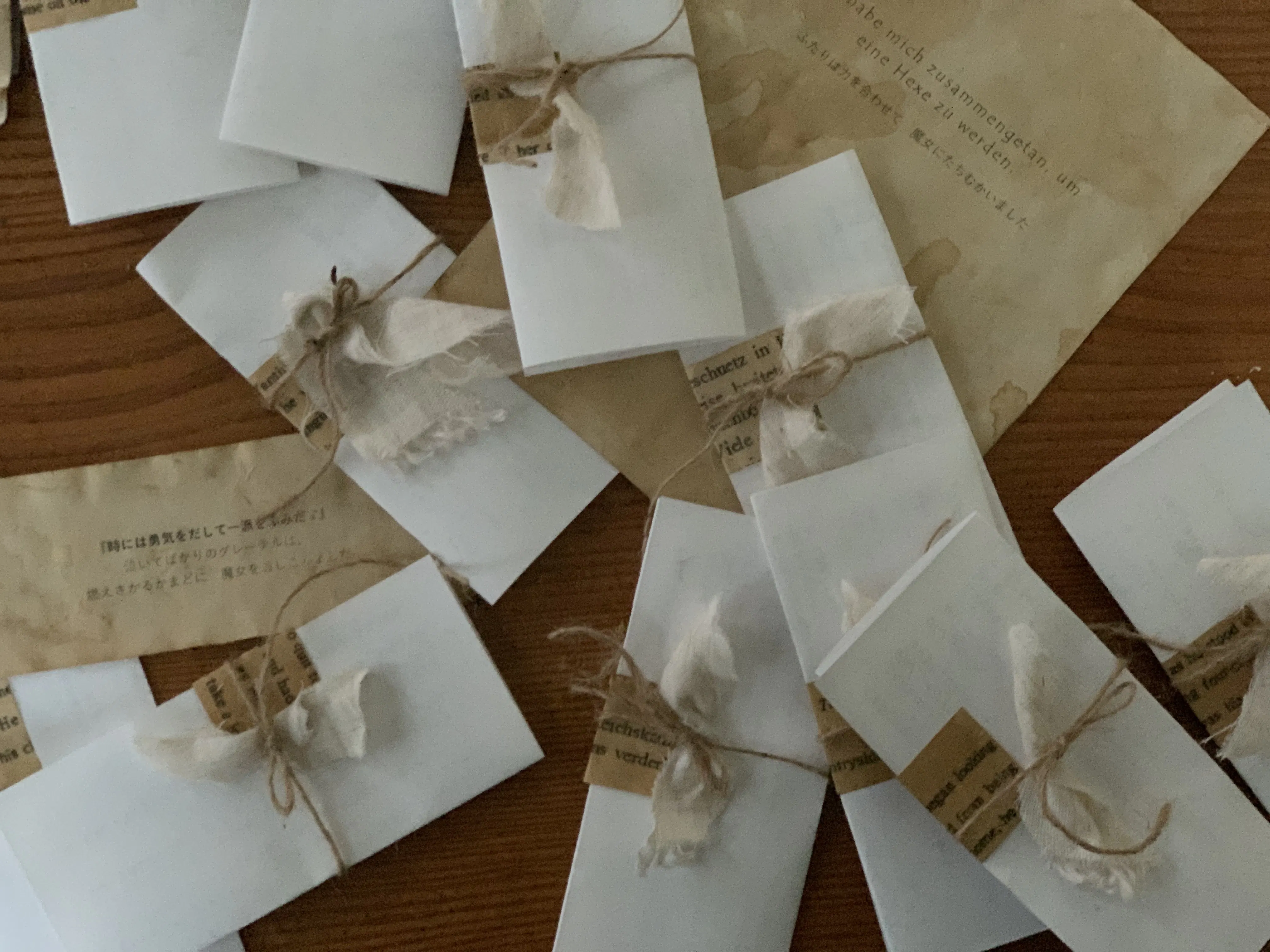 眞鍋さん:今回の展示会で使った平織のタオルをさいてリボンみたいはどうかな..画像