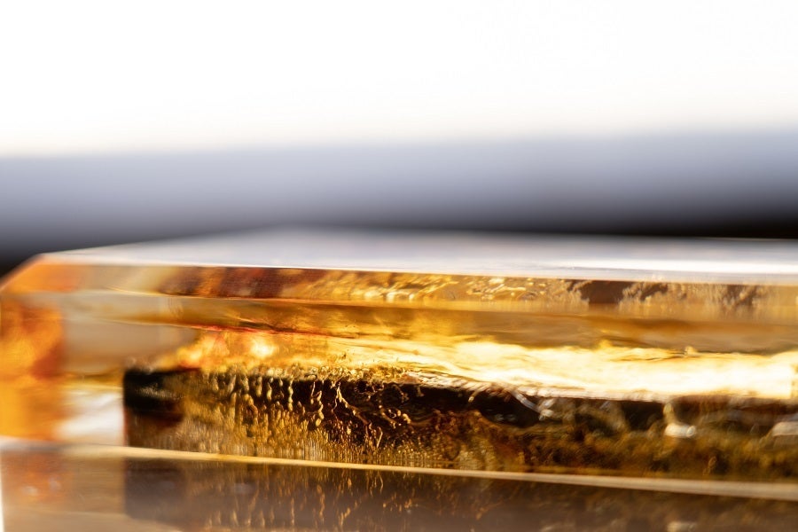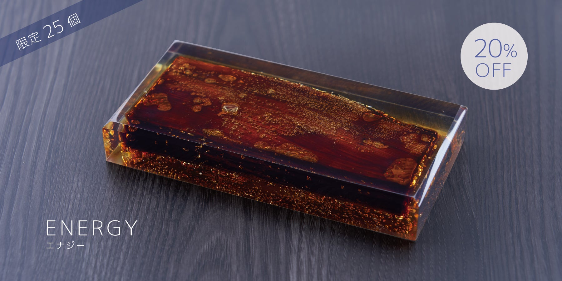 全てが偶然の産物で、気泡や天然樹脂のあふれる様子は、マグマのようなエネルギーを感じます。