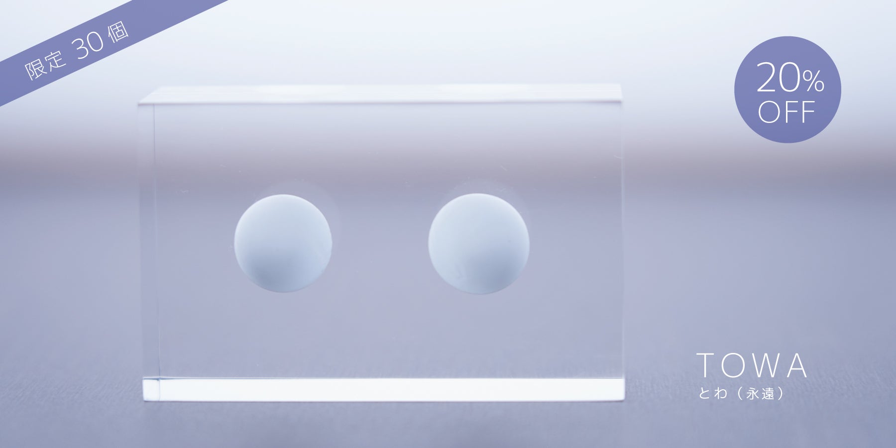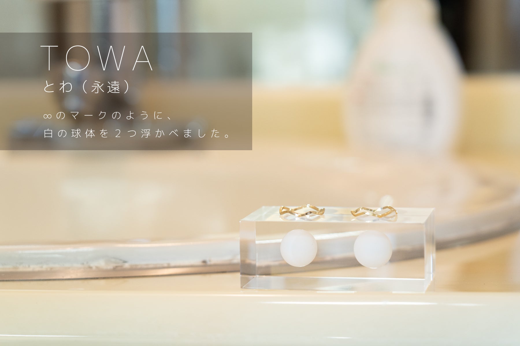 ∞(無限・永遠)のマークを基に、白の球体を2つ浮かべました。全てをそぎ落としたシンプルさが特徴ですが白のもつ柔らかさと純白の表情が ∞=永遠のトワと結びつき結婚リング置きとして完成しました。忙しい日々の中でリングを置く一瞬でもホットできるタイミングになるのではないでしょうか。