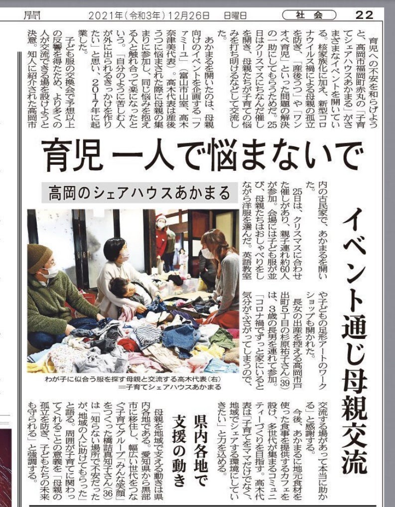 12/25子育てシェアハウスあかまるのクリスマスフェスタが行われました!当日はたくさんの家族が遊びに来てくれて、今までにない大盛況となりました^ ^そんな中、北日本新聞さんに取材していただき、掲載となりました!ありがとうございました!