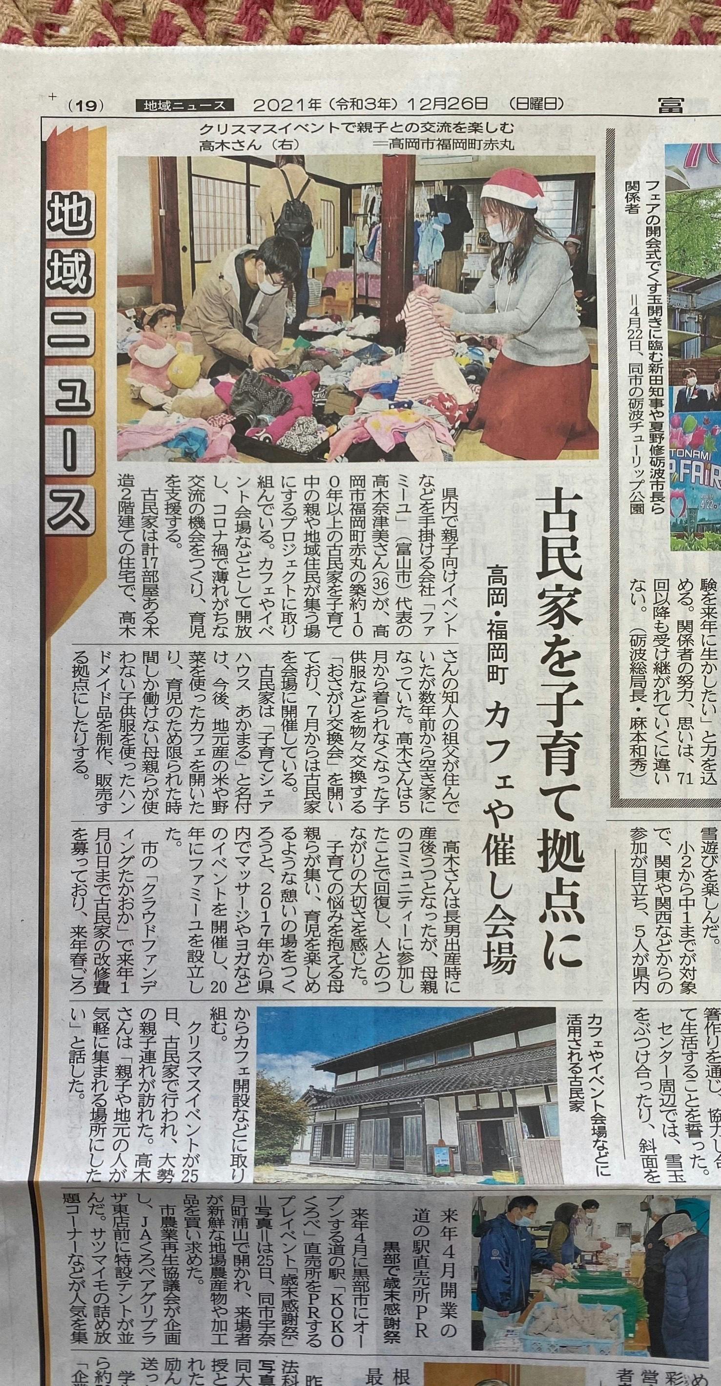 当日は富山新聞さんにも来ていただき、子育てシェアハウスあかまるへの思い、これからの活動など掲載していただきました!クラウドファンディングについても書いていただきました☆