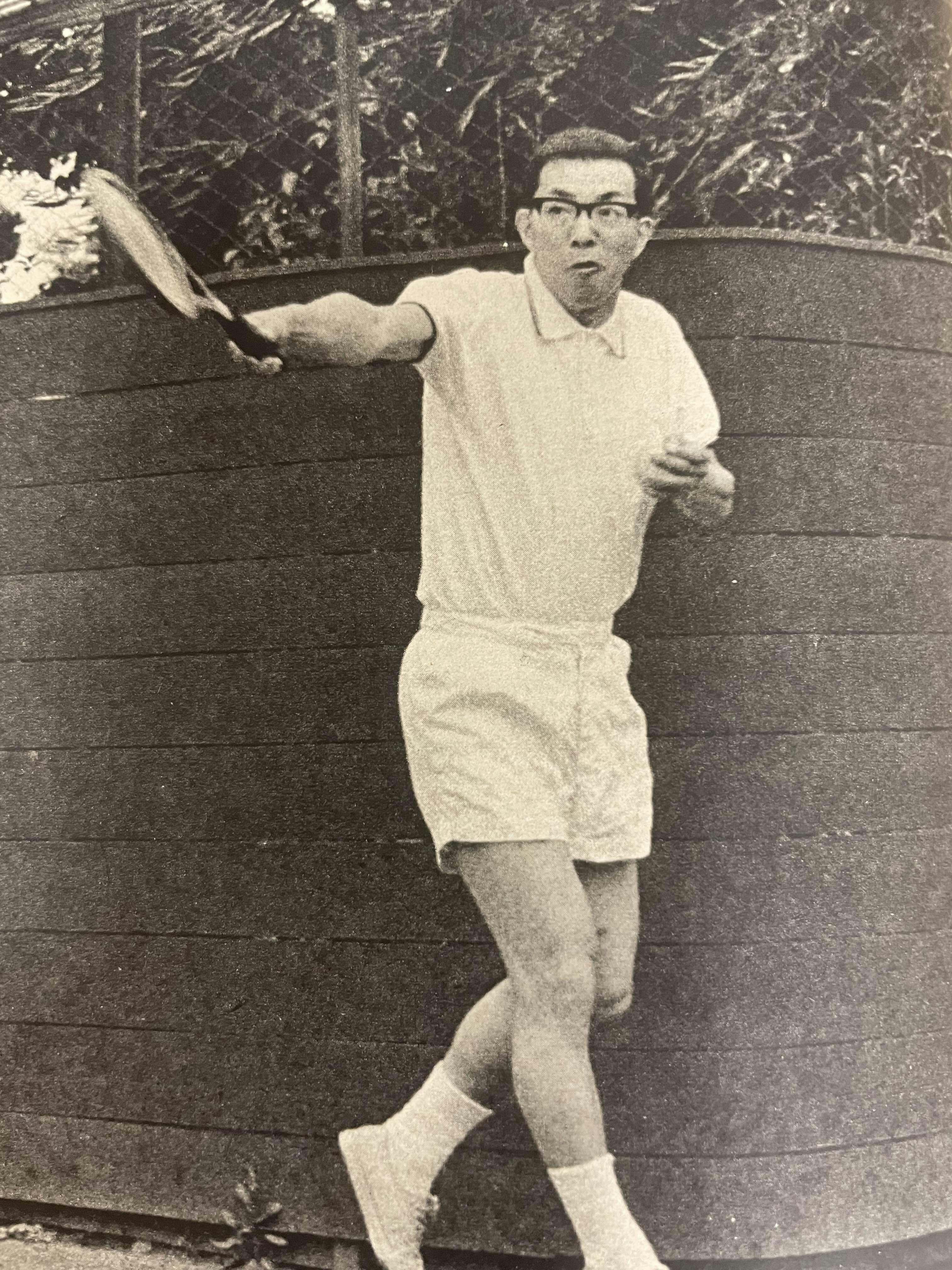こちらの写真は50代の駿河敬次郎先生です。先生は80代でもテニスを続けていました。