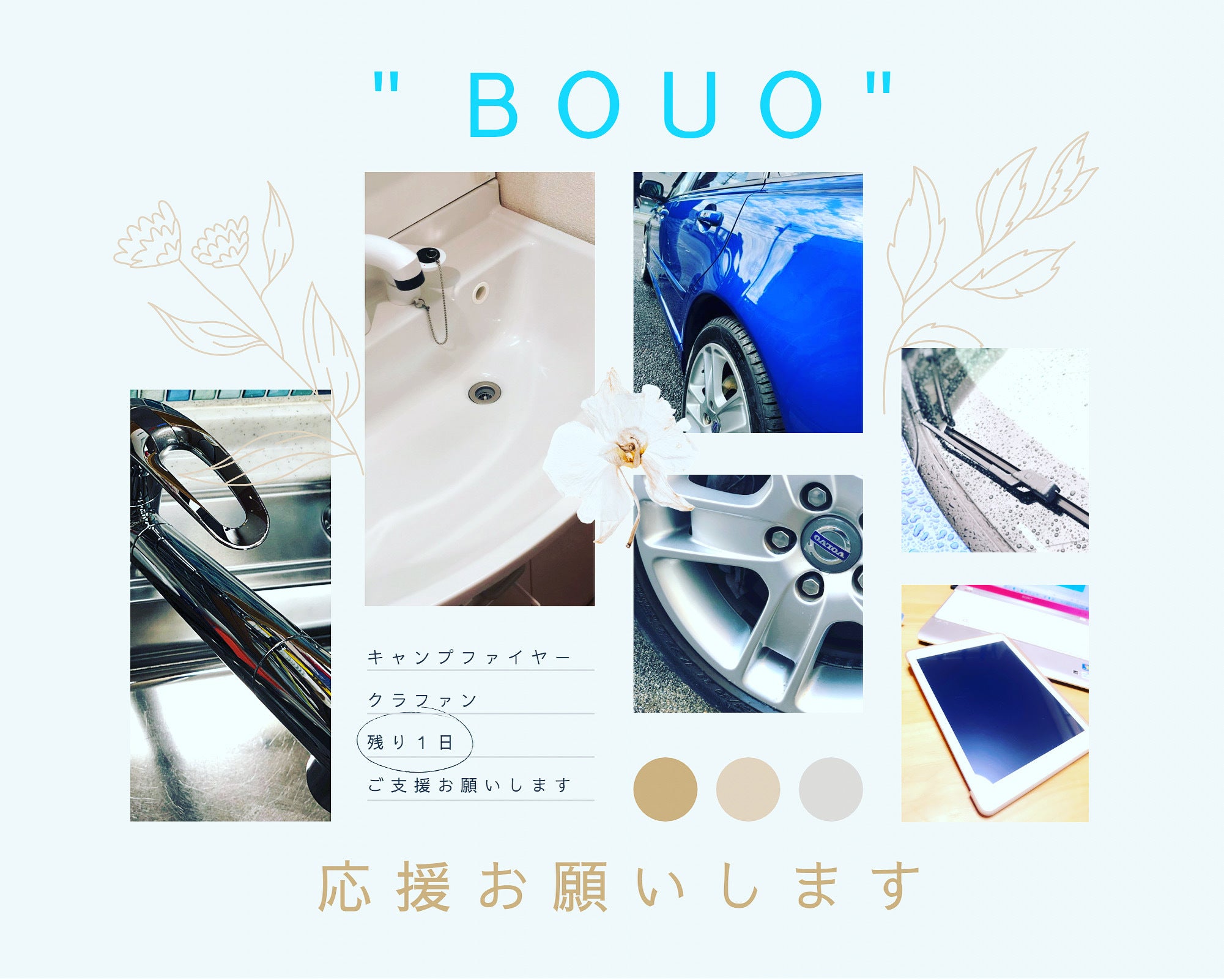 こんにちは。株式会社OPS岩崎です。プロジェクト終了まで、あと8時間になってしまいました。ご支援いただいた皆様、ありがとうございます。最後まで頑張ります。初めてご覧になる皆様。初めまして。弊社コーティング剤”BOUO”、これ1本でお家の水回りからクルマも一台マルっとコーティングできます。皆様の家事のお手伝いになると思います。ぜひぜひ、1本いかがでしょうか?あと8時間、ご支援お待ちしております。よろしくお願いします。最後まで読んでいただき、ありがとうございました。株式会社OPS岩崎