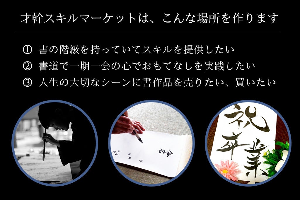 ✥ 書家をはじめ「段級位(師範資格含め)」を持っているが教える機会がない、「書き溜めた作品の行き場がない」「自分の技術をお金に変えたい」、そんな想いを持つ全ての人が、気兼ねなく書の技術を出品でき、また才幹スキルマーケットに訪れた人はいつでも本格の書に出会える。
