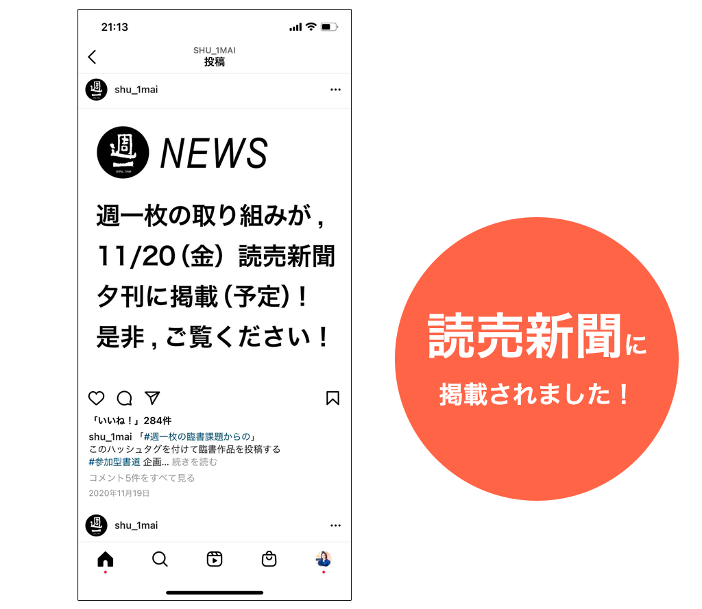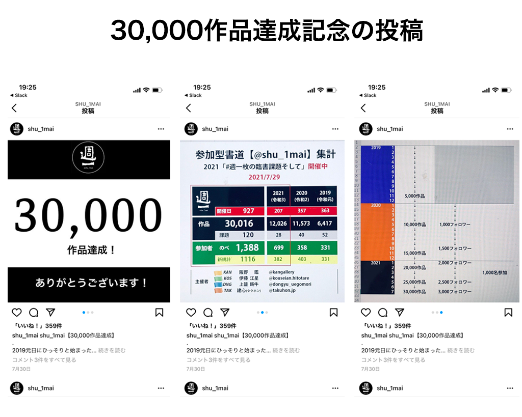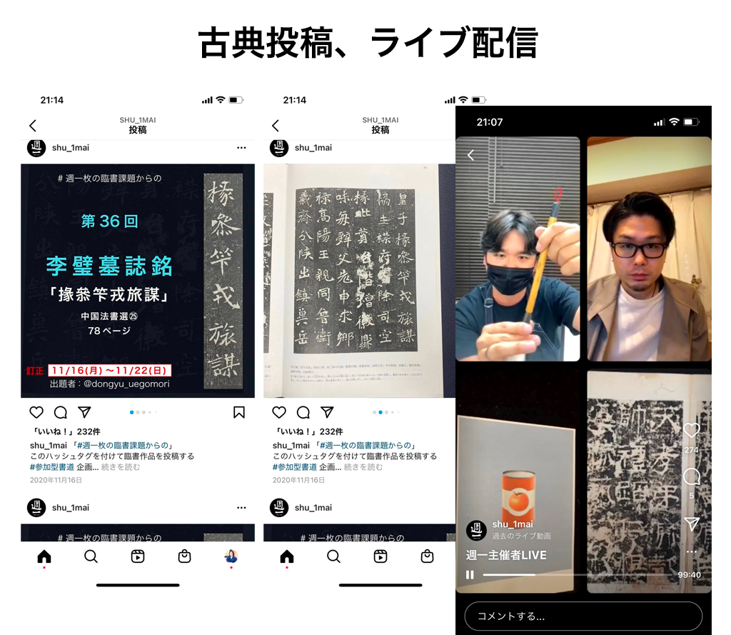 ”キャリア不問、申込不要の参加型書道”と銘打ち、2019年1月1日から Instagram にて「#週一枚の臨書課題」を始めたところ、投稿数は累計30,000件以上、出題課題はのべ130課題以上、最大いいね数は1,000件を超えるコミュニティにまで育つ。敷居の高い勉強方法が身近になれば、書を見直すきっかけになるのではないかという思いで始めた活動が、書家の仲間を集め、古典からの出題、ポイントを解説し、毎週地道に続けてきたところ、あっという間にこの「#週一枚の臨書課題」というタグは認知拡大されフォロワー数も上昇した。