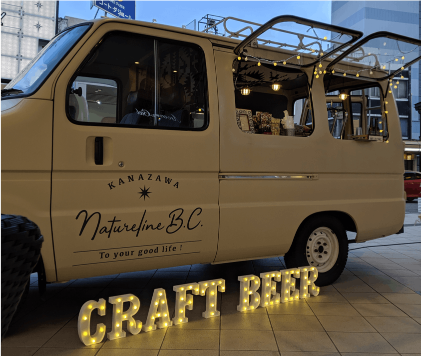 まだ会社員をしていた私(酒尾)でしたが、なにかクラフトビールに関わっていたい、自分が受けた感動を一人でも多くの方に届けたい、という強い想いから始めたのがビアトラックでした。妻に隠していた貯金をはたいて、販売車を購入・改造し、空冷のための冷蔵庫を載せ、カウンターに3タップ。金沢駅前やまちなか繁華街などで、OEMのオリジナルビールを提供してきました。また酒販免許も取得してボトルビールとしての販売など、少しずつチャレンジの幅を広げてきました。