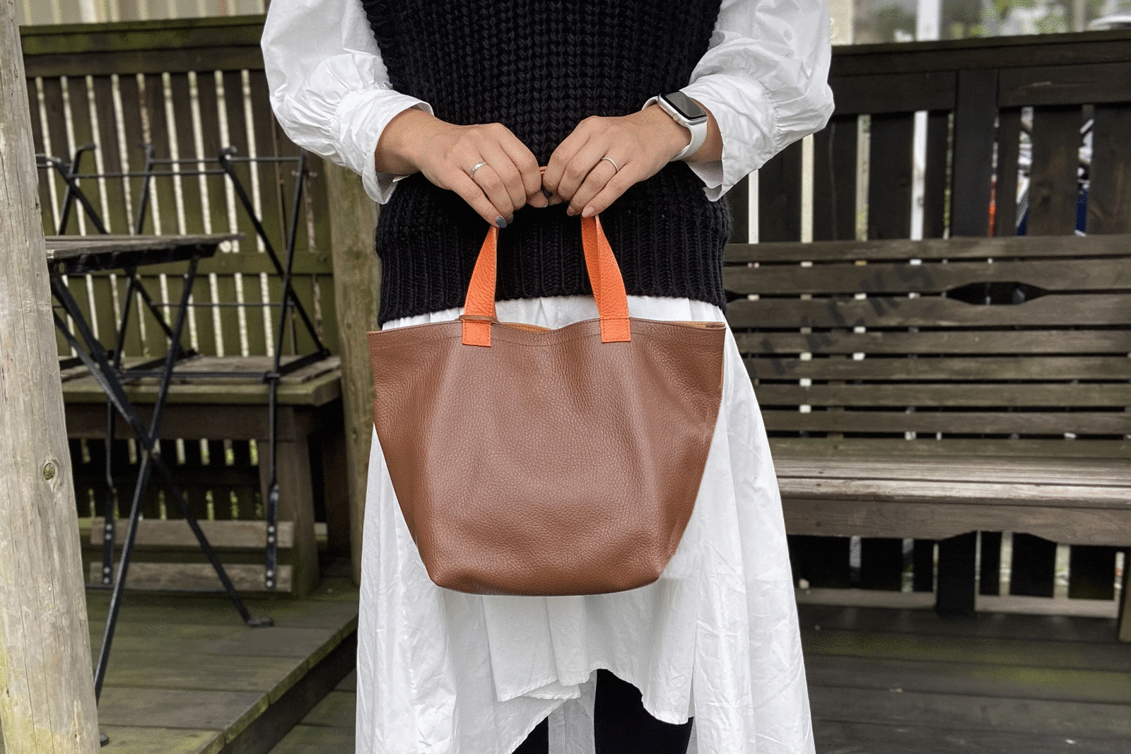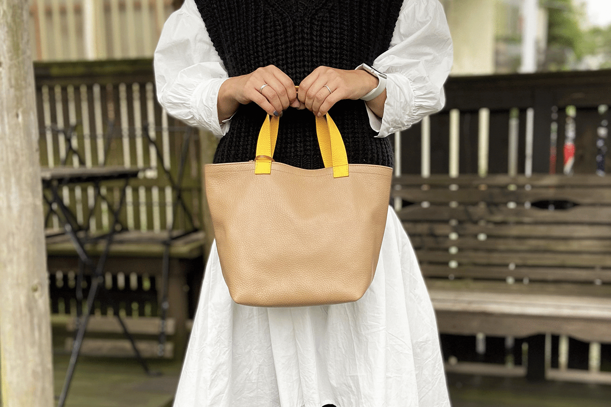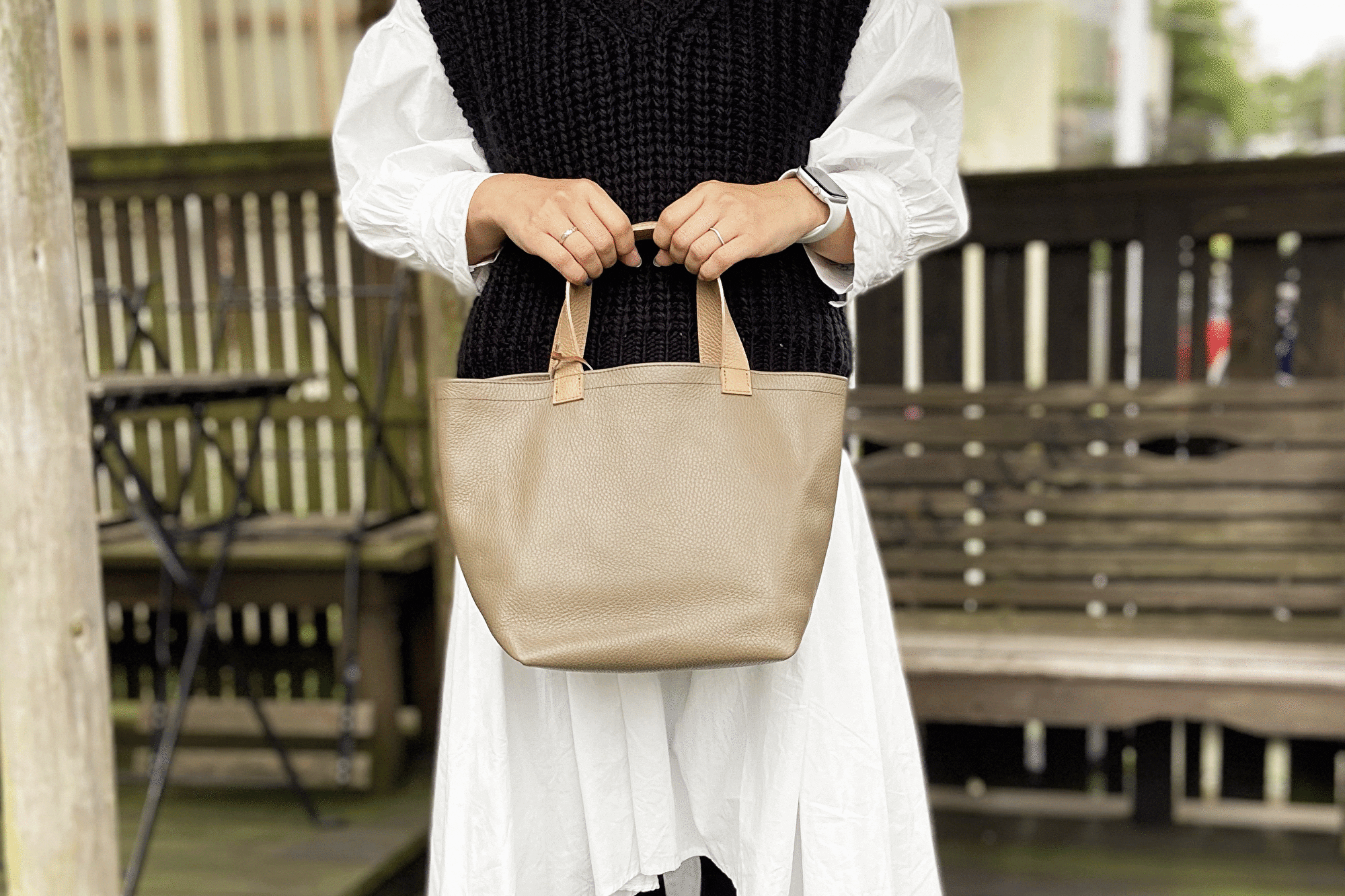 必要な物だけ持ち歩く “ちょうどいい” サイズのレザーミニトートバッグ 持ち物も断捨離!