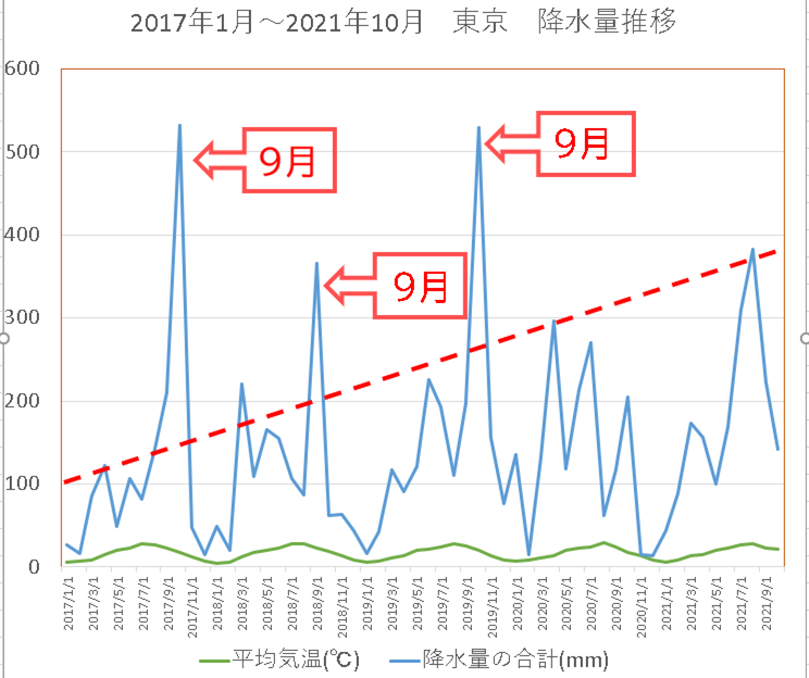 しかも統計的に一番雨量が多いのは、9月です。梅雨時期の6月よりも9月の方が、断然雨が降っています。これは台風の影響が大きいと言われています。あまり意識していない季節でも、9月は相当雨に降られていると言えます。