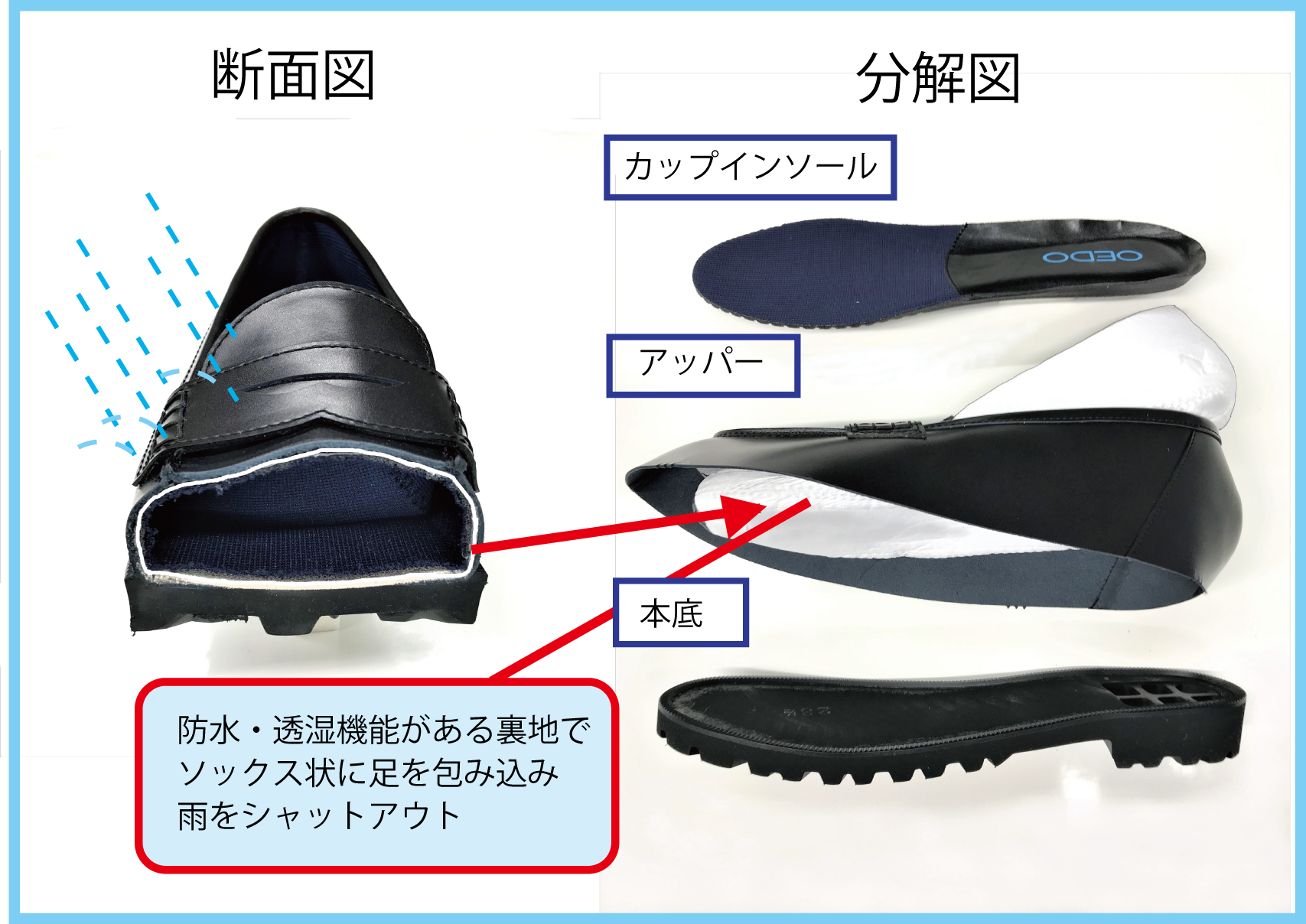 こうして何度も失敗を繰り返して出来上がったのが、雨に濡れない【OEDO】ローファーです。