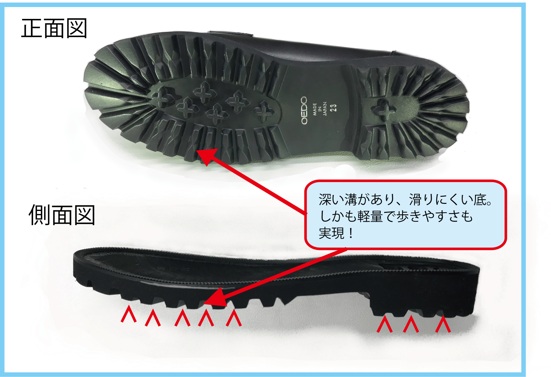 軽くて疲れにくい底材を採用。深い溝があり、雨の日でも滑りにくいタンクソールです。