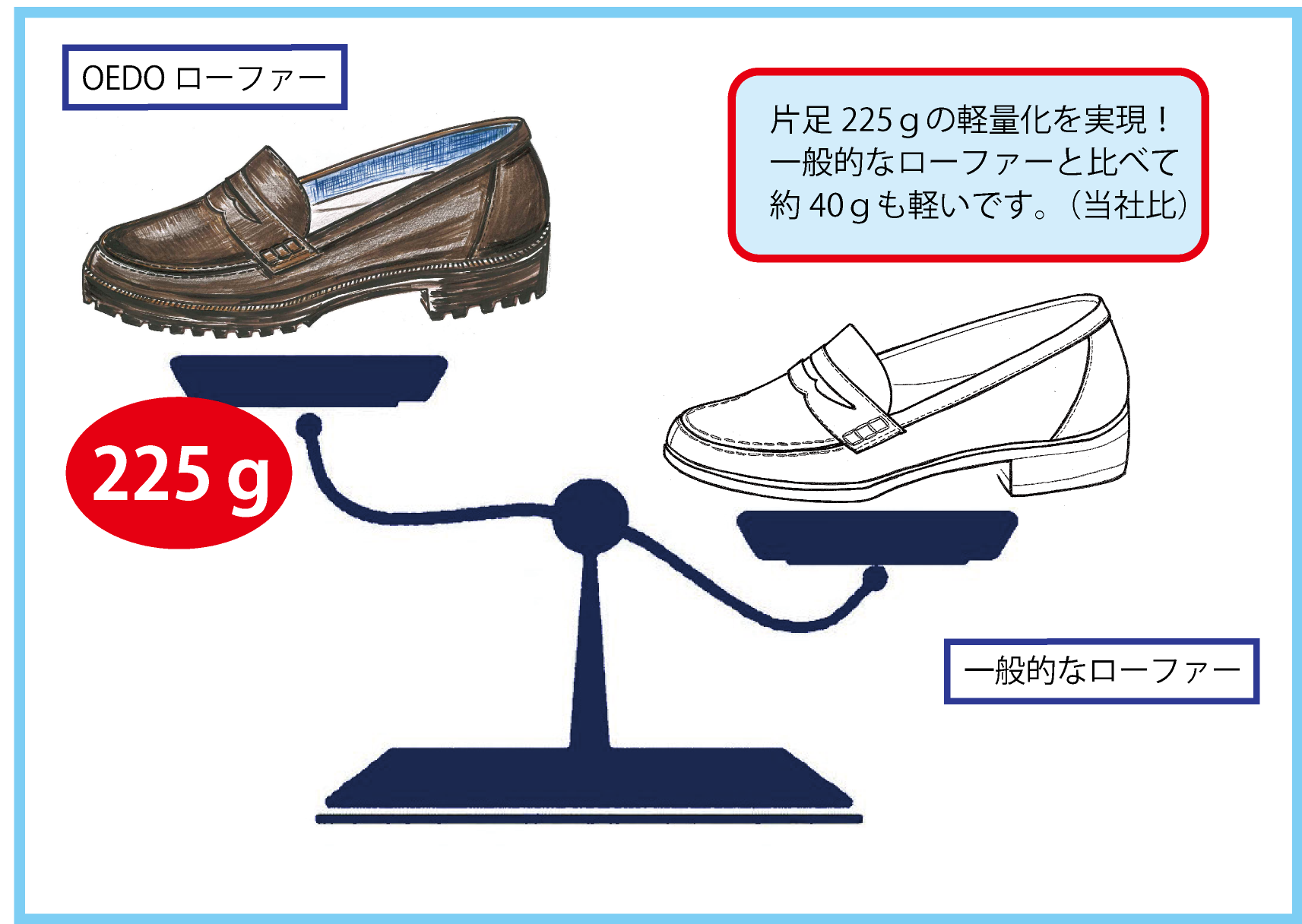 一般的な標準のローファーに比べると、なんと約40グラムも軽い!軽くて長時間歩いても疲れにくい靴にしました。