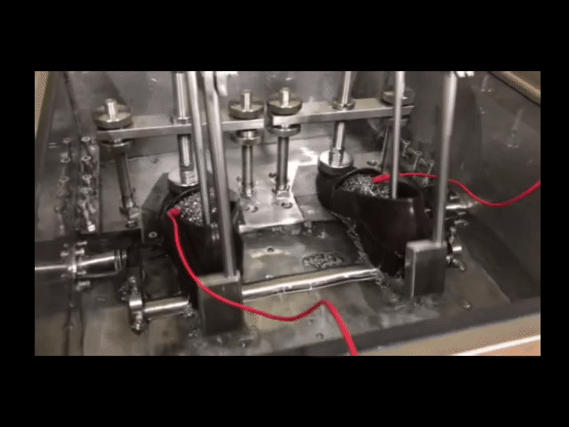 防水をうたう以上、浸水検査の基準を満たす事が必要です。この検査では、水を張り、靴の内部に水が浸入すればブザーが鳴ります。歩行に似た動きで、屈曲を繰り返します。水中での屈曲試験を