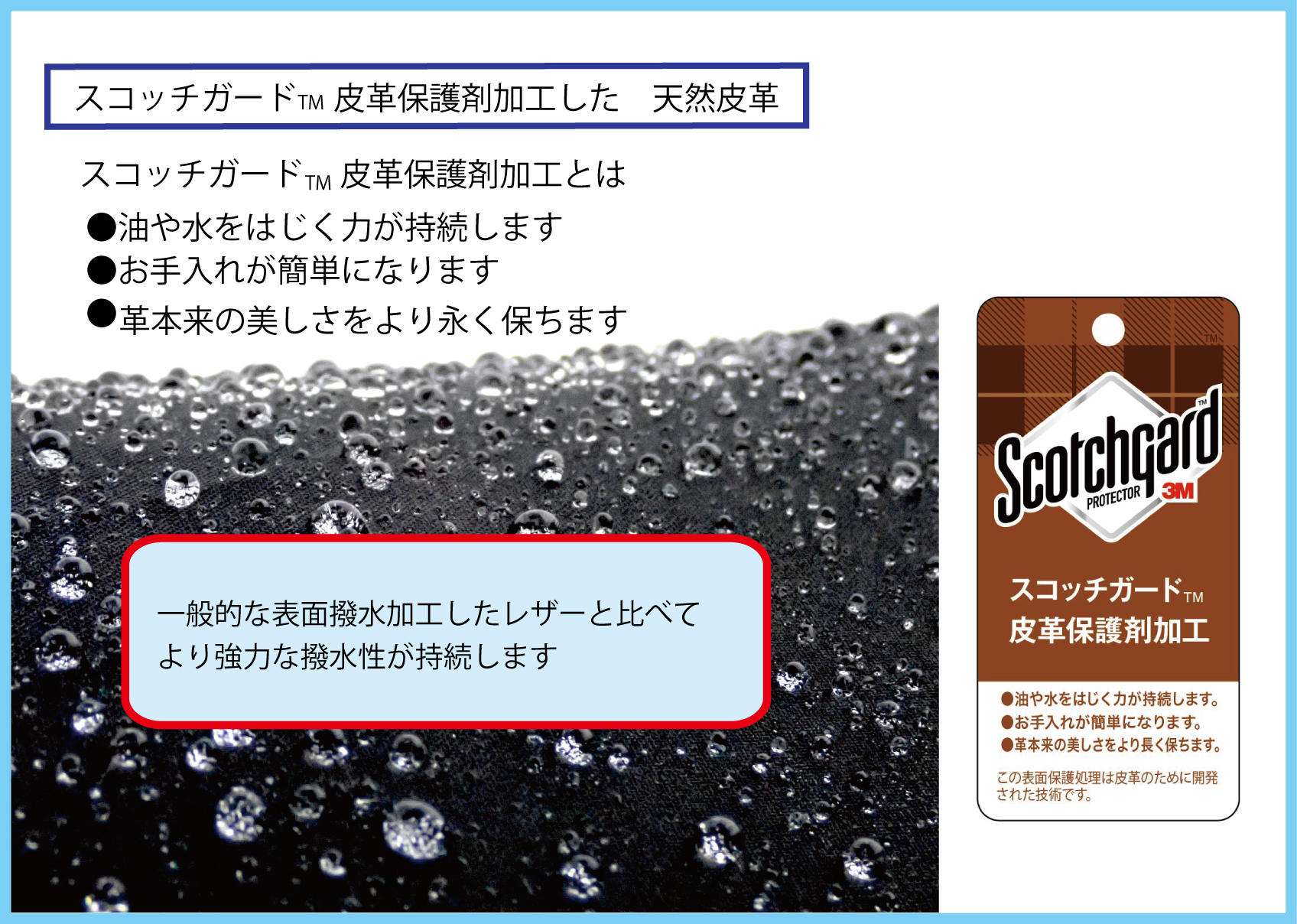 1.水をはじくスコッチガード(TM)皮革保護剤加工した本革