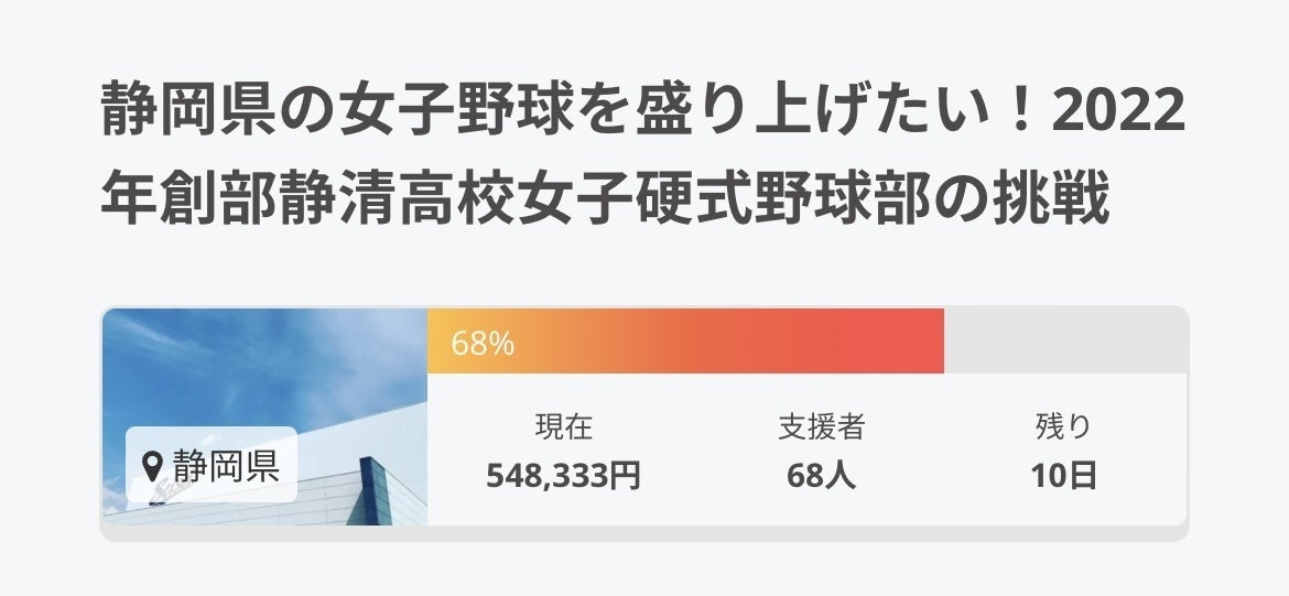 【クラウドファンディング24日目】本日もご支援、ご声援を頂きありがとうございました^ ^クラウドファンディングを始めてはや24日が経ちました。毎日多くの方にこの発信をSNSで見て頂き日に日に多くの方に認知して頂けているな...と感じる毎日です。ありがとうございます。【進捗率78%】【73名様 628,513円】となっております。本日は『入学式』でした!!!学校の桜は満開^ ^天気も良く入学式日和でした。15名の女子野球部員が本日入学し、いよいよ明日から本格始動となります。今年度より男女共学!そして新校舎、新制服となり学校としても新たな歴史を作るときです。女子野球部員が学校の模範になるような集団へとなっていきたいと思います。『戮力協心』静清高校女子硬式野球部スローガンです。今後とも温かいご声援をよろしくお願い致します。本日もありがとうございました。残り9日です。もっともっと多くの人に認知して頂けるよう努力していきたいと思います。皆様もSNSなどでのご協力よろしくお願い致します。