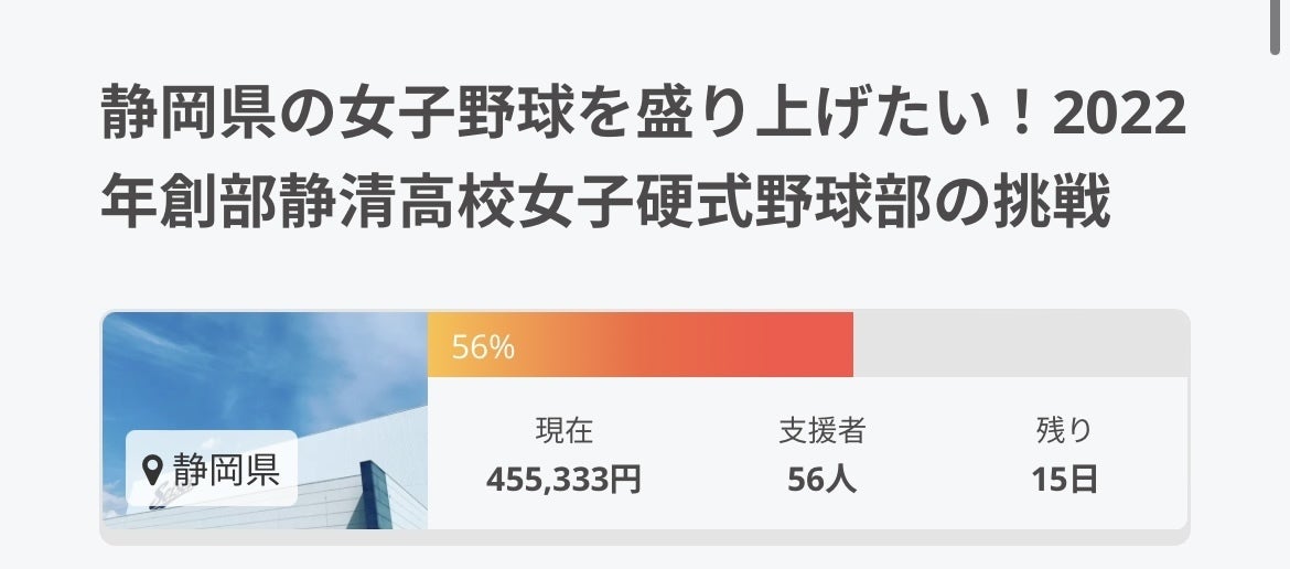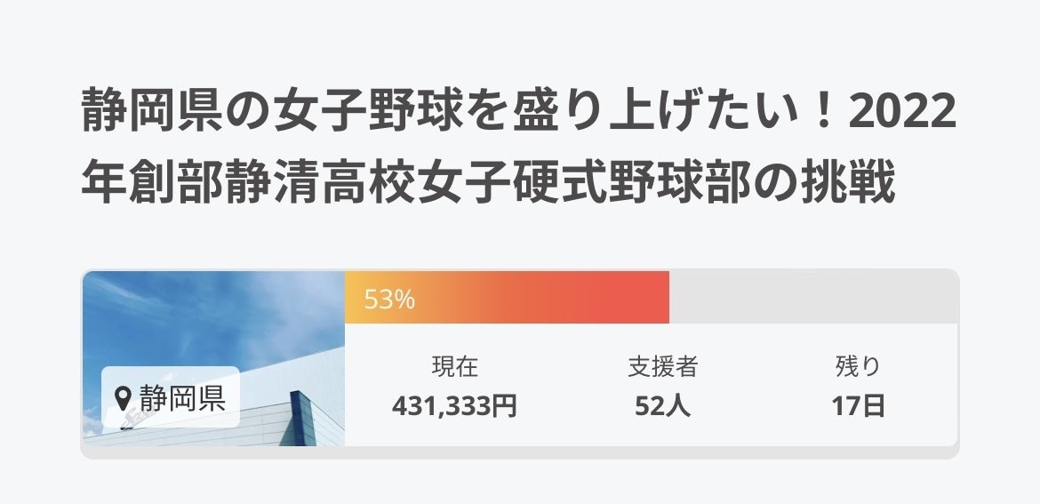 クラウドファンディング【17日目】【進捗率56%】【56名様 455,333円】となっております。本日もご支援、応援メッセージなどを頂きありがとうございます^ ^3月ラストとなりました。明日からは新年度のスタート!!!そして静清高校女子硬式野球部始動!!明日から入寮、そして練習開始です。これまでの準備期間...本当に色々なことがありました。全てが初めての経験で、戸惑うこと、上手くいかないことも沢山ありました。逆に今までのお付き合いもあり、多くの人に色々な形で支援を頂いたり、嬉しいことも沢山ありました。これからの未来も初めてのことがたくさん出てくると思いますが、明日からは『未来の女子野球選手の為に』何があっても挫けずに頑張りたいと思います。温かく見守って下さい。そして時に助けて下さい。多くの方に応援してもらえるチームファンの多いチームを作ります。多くの方にお世話になった今年度。感謝申し上げます。明日から新年度!気持ちを新たに頑張ります。今後ともご支援、ご声援のほど宜しくお願い致します。