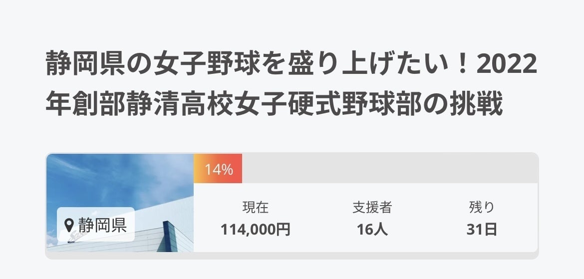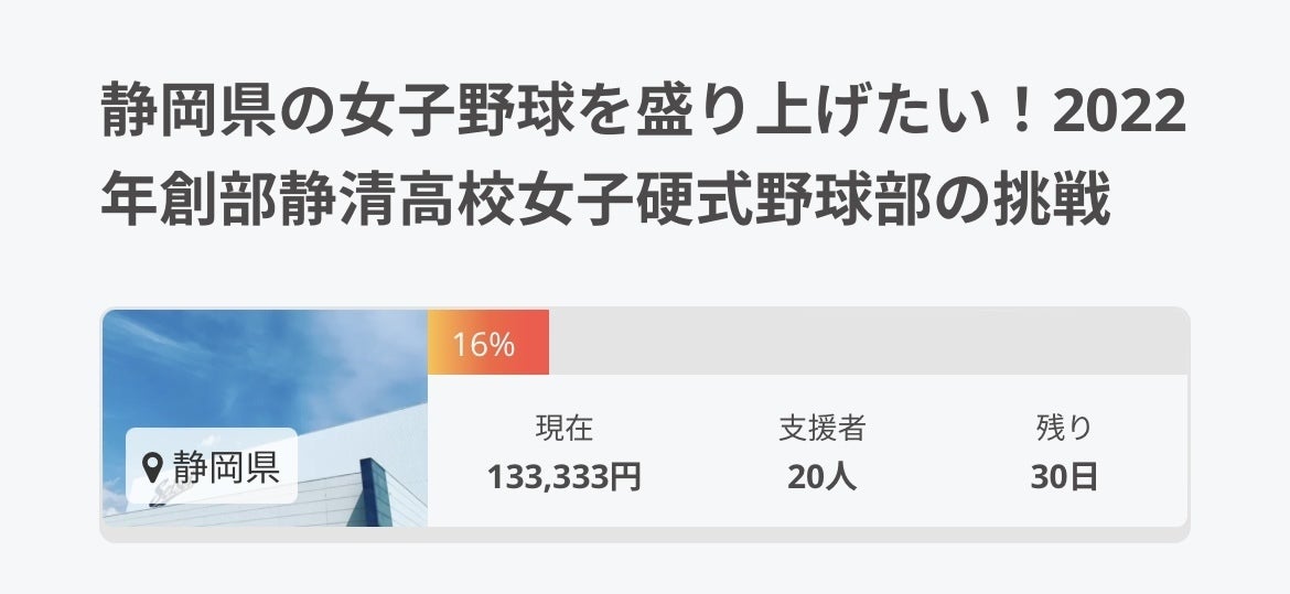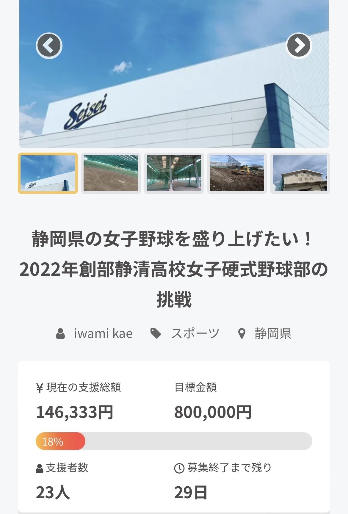 クラウドファンディング4日目!本日もご支援頂き感謝申し上げます。『進捗率20%』『27名様 162,333円』となっております。お陰様で進捗率20%達成!ありがとうございます!!今までお世話になった方、先輩や後輩、学校近隣の地域の方や野球を通じて出会った方、ファンの方など本当に多くの方にご支援を頂き、大変嬉しく思います。女子野球はこれからのスポーツです。まだまだカテゴリーごとの底辺作りが必要ではありますが、多くの女子野球関係者がこれからの女子野球の為に様々な方向から動き、尽力されています。私が4月から挑戦する事はその中でも力になるかならないかわからないほどの微力ではあります。私一人では何もできず、何の貢献もできません。こうして多くの方にご支援やご協力を頂き作り上げて行くスポーツの一つであると思います。これからも力を貸してください。。。子供たちにも必ず皆さんへの感謝と思いを伝え届けて野球をしたいと思います。本日は長文失礼いたしました。以上4日目の報告でした。今後ともご支援、ご声援のほどよろしくお願い致します。