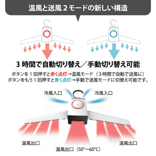 また温風モードは3時間以上連続で使用すると、安全のため自動で冷風モードに切り替わるので長時間の使用も安心してお使い頂けます