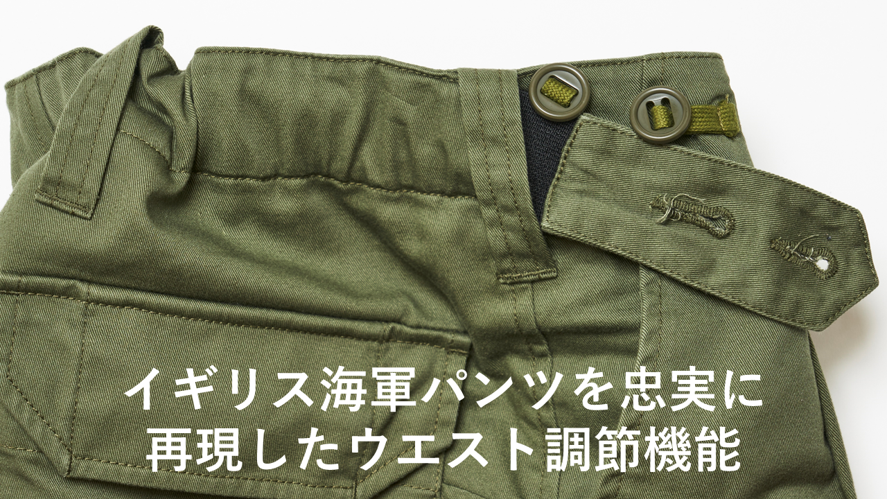 両脇にある釦を留めれば2段階のウエスト調整が可能で、着用しながら出来るのが特徴です。