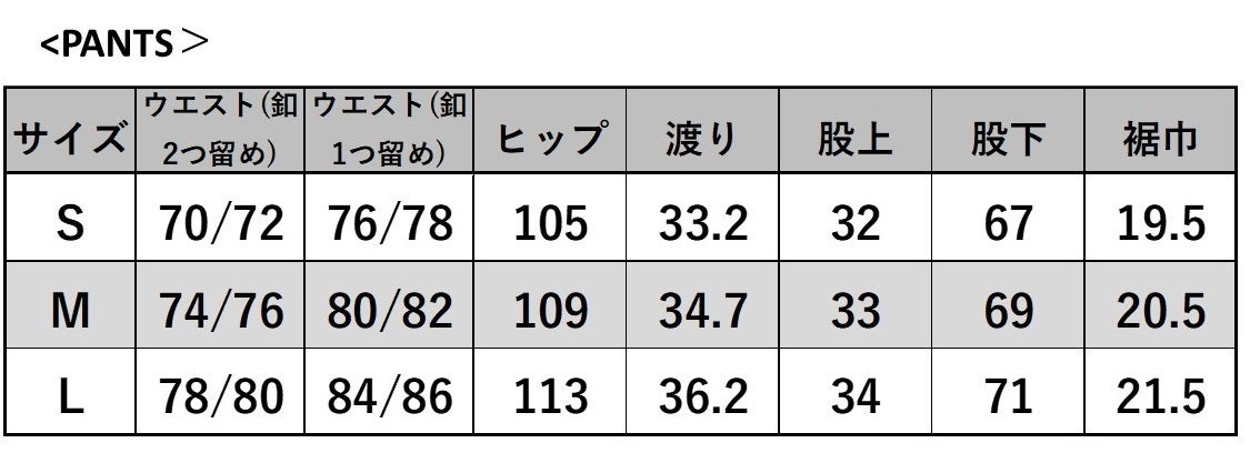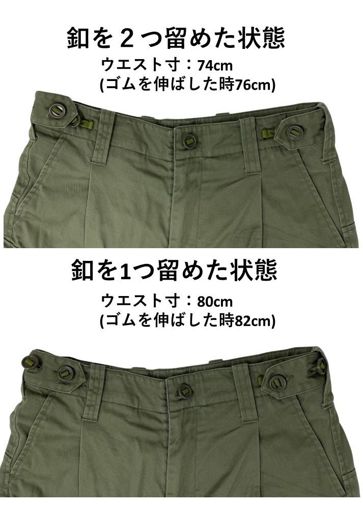 着用した状態でウエストを2段階に調節できる機能的な仕様です。ウエストの後ろ側にはゴムが入っているのでイージーパンツとしてもお使い頂けます。ループもあるのでベルトも着用可能です。(ウエスト寸法/Mサイズ)