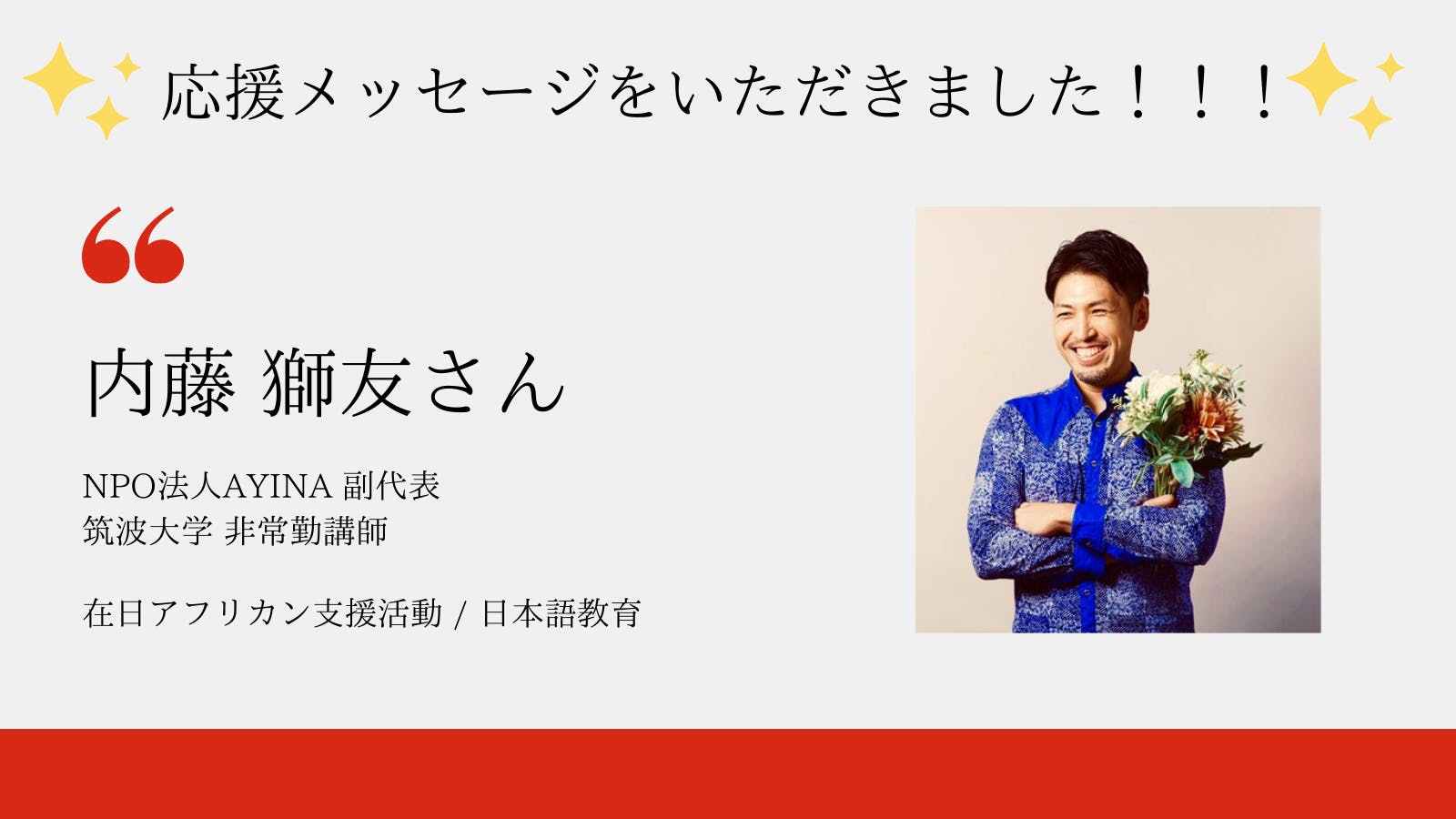 今回は在日アフリカン支援をメインに活動されている内藤 獅友さんから応援メッセージをいただきました!!!(ツイッター@Naikel0311)