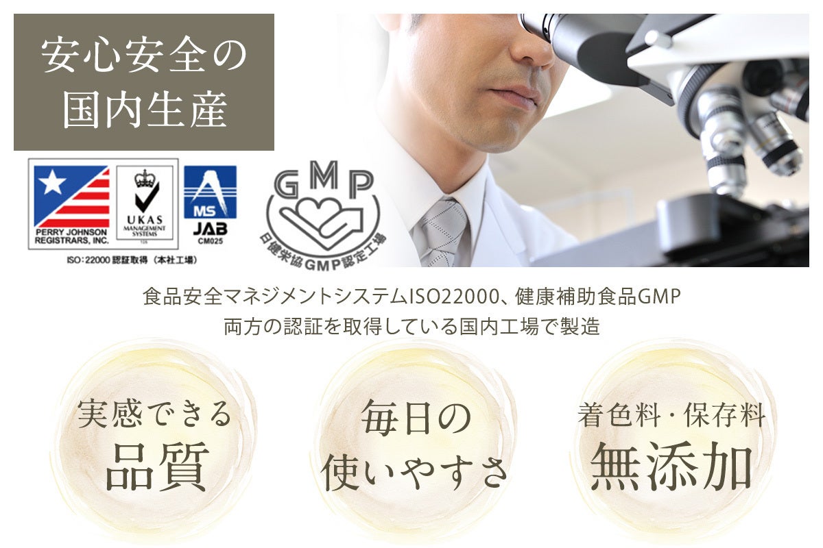 食品安全マネジメントシステムISO22000、健康補助食品GMPの両方認証取得している国内工場で製造しています。