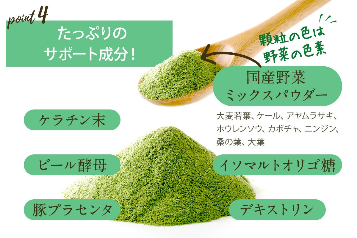 マルトデキストリン、イソマルトオリゴ糖粉あめ、 ヤギミルクパウダー、フィッシュコラーゲン、ビー ル酵母、大麦若葉パウダー、ケラチン加水分解物、ケー ルパウダー、アヤムラサキパウダー、豚プラセンタ エキス、ホウレンソウパウダー、カボチャパウダー、 ニンジンパウダー、桑の葉パウダー、亜鉛含有酵母、 デキストリン、大葉パウダー