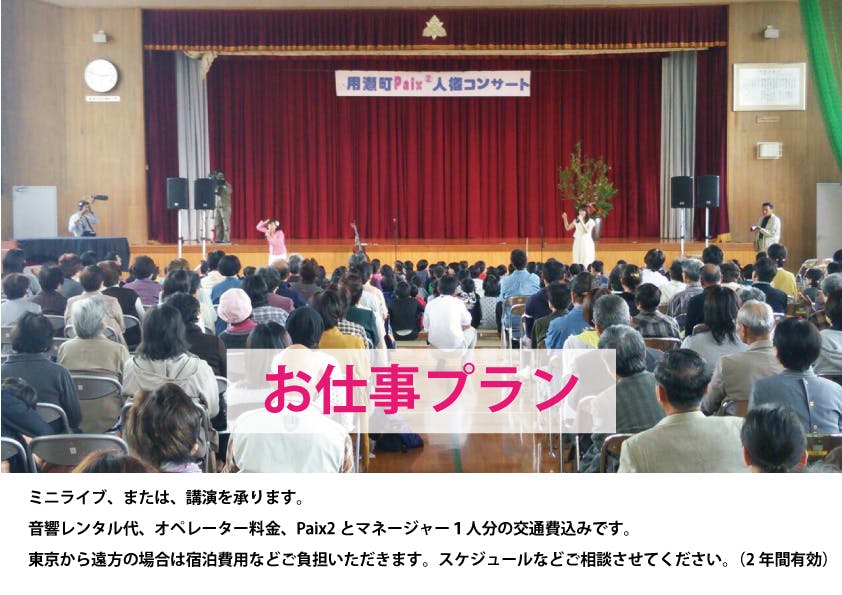 コロナ禍のため、慰問行事が行われない刑務所の受刑者に向けて制作。某長期収容施設の受刑者からの質問にPaix2が答えるトークDVDです。そのほかプライベート映像も!!(Paix2のプリズンコンサートは受刑者の情操教育の一環として行われています。)