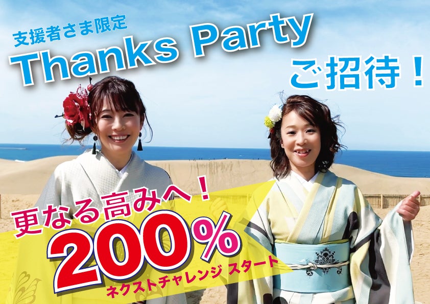 200%達成することが出来ましたら、感謝の気持ちを込めて「Thanks Party」を開催し、ご支援してくださったみなさま全員を対象に、ご招待させていただきたいと思います。(2022年2月開催予定。コロナの影響によって開催時期が変更になる可能性があります)