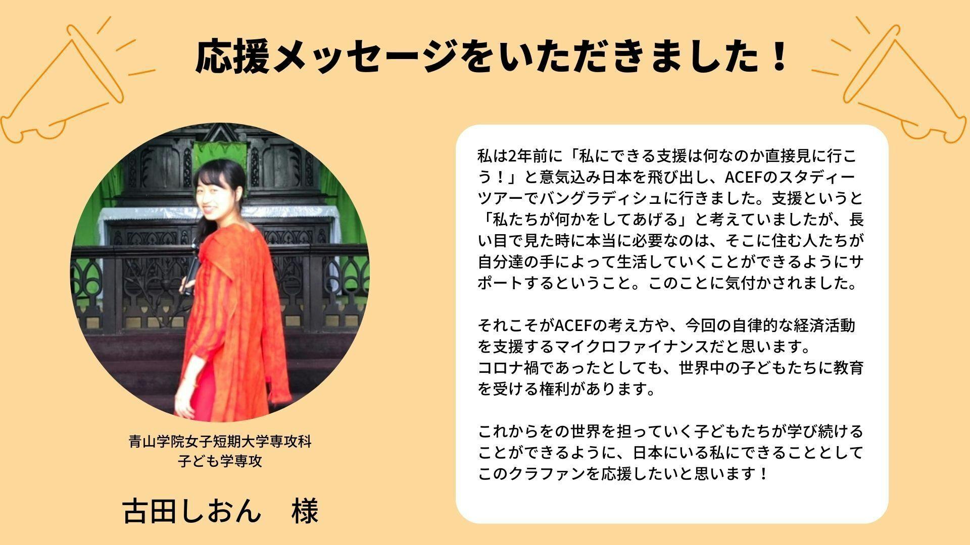 青山学院女子短期大学専攻科 子ども学専攻の古田しおん様から応援メッセージをいただきました!