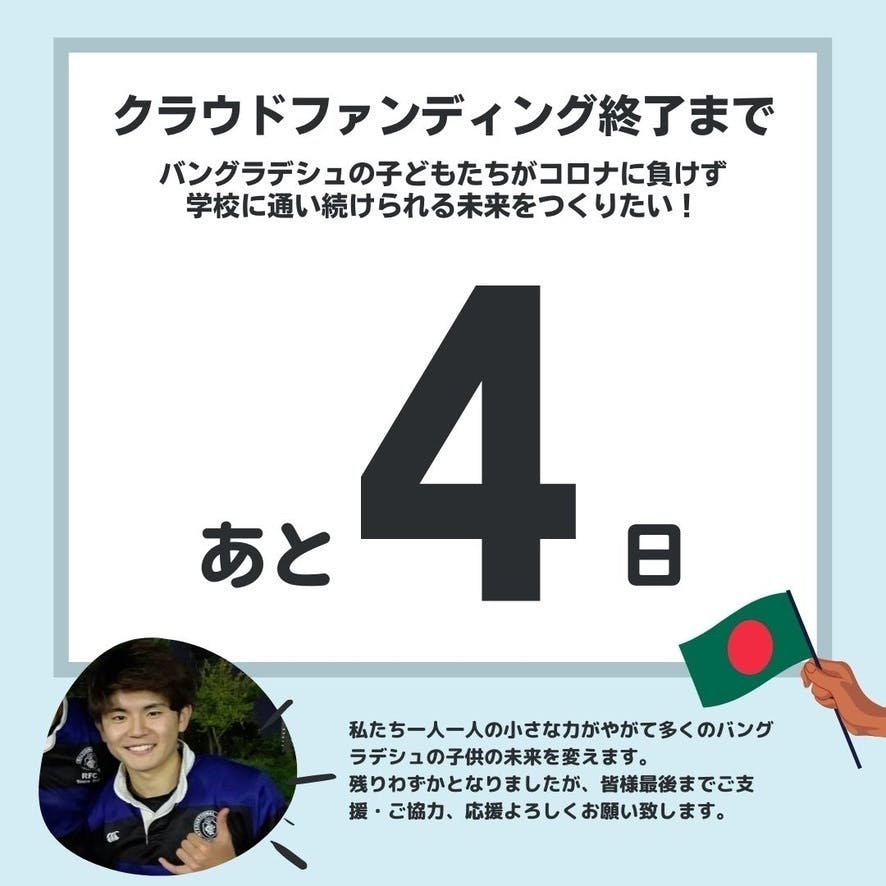 高校2年生の時に訪問したカンボジアで教育を受けることのできない子供たちを目の当たりにし途上国での教育支援に興味を持ち始めました。少しでも途上国で暮らす子供たちに教育を与える力になりたいという思いで活動して参りました。クラウドファンディングをはじめ、イベント企画など様々なプラットフォームで皆様の思いやご支援を頂いたことを、とても嬉しく思います。クラウドファンディング期間も残り4日となりましたが、最後まで情報の拡散を通して少しでも多くの方々に私たちACEFの思いが届くよう努めて参ります。皆様、どうか最後までご協力・ご支援、応援よろしくお願い致します。