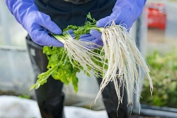 寒冷地の三関では、せり がゆっくり生長し、葉茎より根が伸びます。そして、清浄な伏流水が根の生長を助けるだけでなく、収穫後の徹底した洗浄に用いられ、根まで食べられるセリとして流通しています。