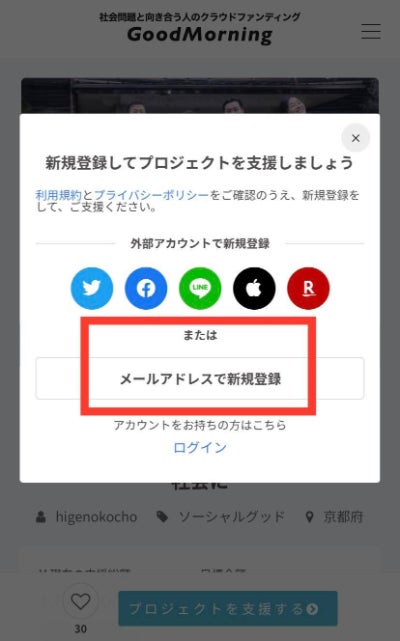 ※CAMPFIREの会員登録となっていますが、本クラウドファンディング「GoodMorning」はCAMPFIREの ブランドです。