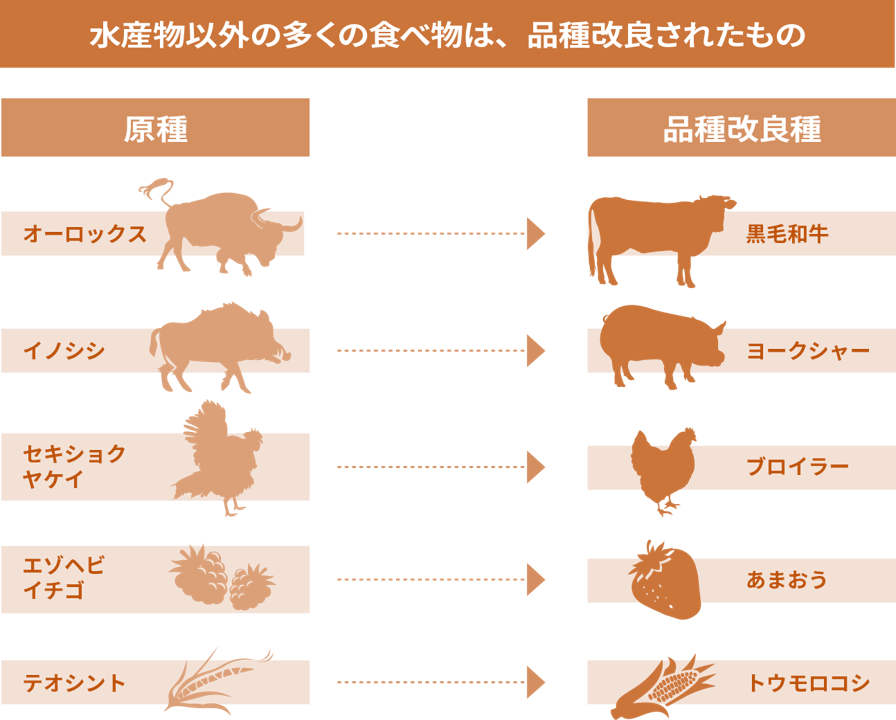 現在、私たちの身の回りにある食品のほとんどは、品種改良されたものです。畜産物・農産物のうち、品種改良されていないものはミツバくらいと言われています。しかし、水産養殖については歴史も浅く、品種改良がほとんど普及していない実態があります。